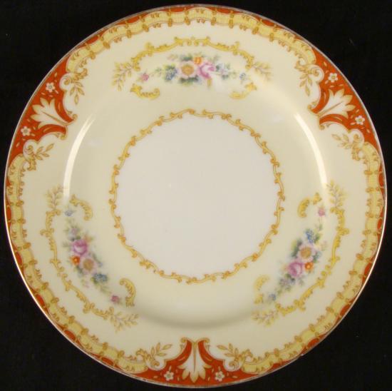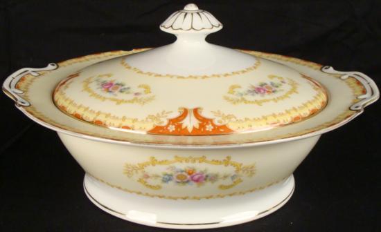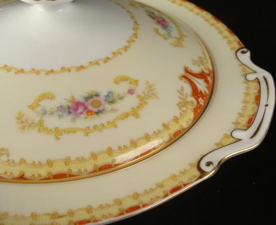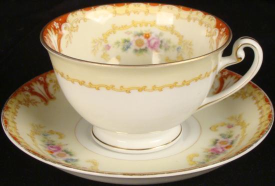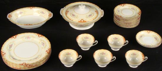 This is yet another fine example of the Newton Estatedineerware set. A 23 piece set of Ransom China, in pattern RNS3, made in Japan. It has been used, but it is in very good condition overall. The colors are bright and the details crisp. The pale yellow and soft floral designs are contrasted by a red border, and gold trim.