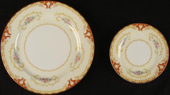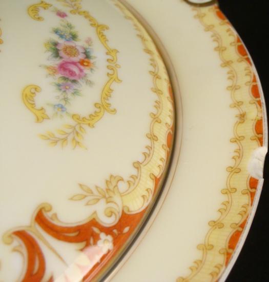 What follows is a complete list of what is included. The first number shows the total, and the number in parenthesis shows how many pieces have slight chips. There are no bad cracks, or transfer wear.9 7/8" dinner plates: 4 6 1/4" salad/dessert plates: 10 (2)3 7/8" teacups: 5 (2)5 1/2" saucer: 210 5/8" oval vegetable dish: 19 1/4" covered casserole dish: (1) -slight rim chipThis is especially nice China to adorn the dineer table.