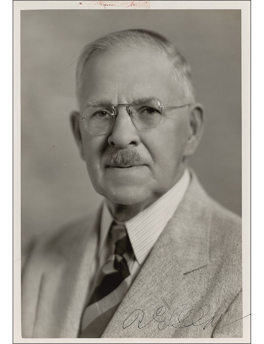 Inventor and automotive magnate (1864–1950) who founded the Oldsmobile and Reo Motor Car Companies. Vintage glossy 4.75 x 7 head-and-shoulders photo, signed in black ink, “R. E. Olds.” Light contrast and irregular adhesion to signature and some light discoloration along top edge, otherwise fine condition. The first signed photo of Olds we have offered.