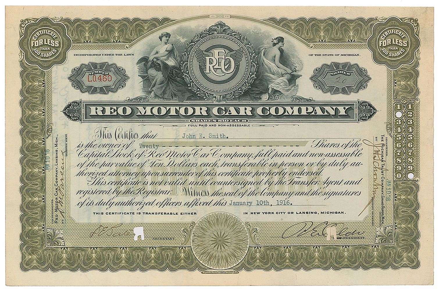 Inventor and automotive magnate (1864-1950) who founded the Oldsmobile and REO Motor Car Companies. DS, signed “R. E. Olds,” one page, 12.75 x 8.25, January 10, 1916. Certificate for 20 shares of stock in the REO Motor Car Company issued to John E. Smith, signed at the bottom by Olds as the company's president. Reverse bears a pair of affixed transfer receipts for the MacCrone Company, both dated January 1923. Certificate bears a highly attractive vignette featuring the REO 'wings' logo with female figures. In fine condition, with a cancellation hole affecting the "O" in the signature.