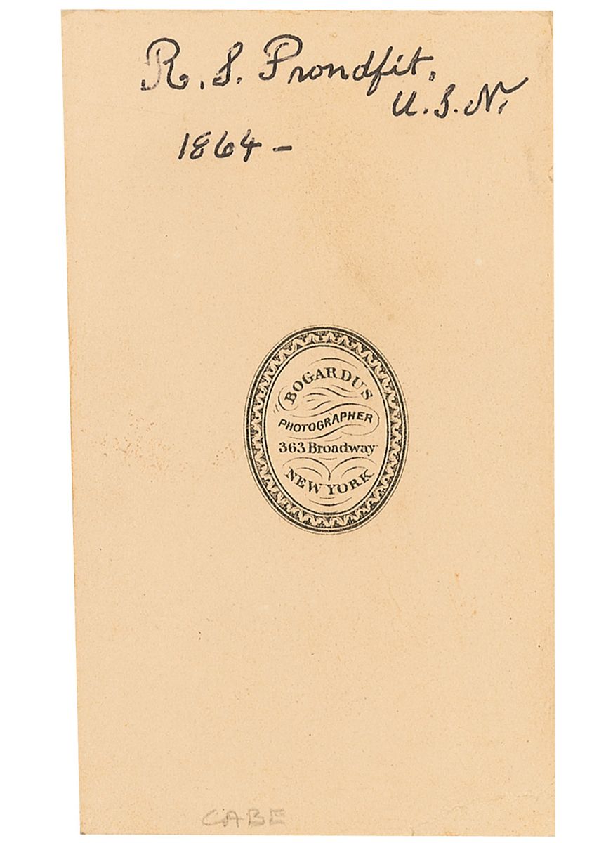 Union naval officer who served from 1863–1866. Original 2.25 x 4 carte-de-visite photo by Bogardus of New York, signed on the reverse in black ink, “R. S. Proudfit, U. S. N. 1864–.” In fine condition, with a crease to lower left corner, a light crease to reverse, and a bit of trivial toning.