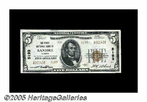 <B>Rantoul, IL</B></I> - $5 1929 Ty. 2 <B>The First NB</B></I> Ch. # 5193<BR>A <B>Choice Crisp Uncirculated</B></I> example with Gem quality paper. We'd have classified this as a Gem without hesitation but for minor centering issues.