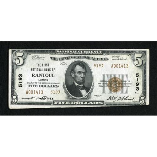 <B>Rantoul, IL</B></I> - $5 1929 Ty. 2 <B>The First NB</B></I> Ch. # 5193<BR> Embossing is found on this <B>About Uncirculated</B></I> $5 that has a sloping bottom cut that reaches the frame line in the right corner.<BR><BR><b>Shipping:</b> Coins & Currency (<a target="_blank" href="http://www.heritageauctions.com/common/shipping.php">view shipping information</a>)