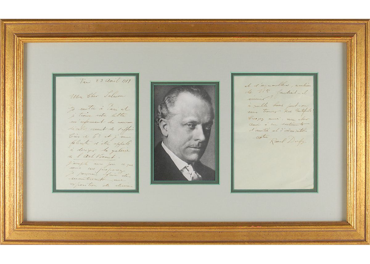 ALS in French, two pages, 5 x 7, April 23, 1919. Letter to poet and art critic Andre Salmon. In full (translated): “Upon my return to Paris I found your letter letting me know about the new growth of Cres and Company. Congratulations for your being called to run the Art Vivant gallery. I gladly accept your offer. I could show some drawings and watercolors right away. How many pieces should be put together? At what time will you be at Rue Hautefeuille?” Nicely double-matted and framed with a portrait of the artist to an overall size of 23 x 14. In fine condition, with a few creases. Salmon published a journal entitled l’Art Vivant, which featured pieces about artists and several illustrations; one of Dufy’s illustrations was published in the 1920 edition, alongside the likes of Matisse and Picasso.