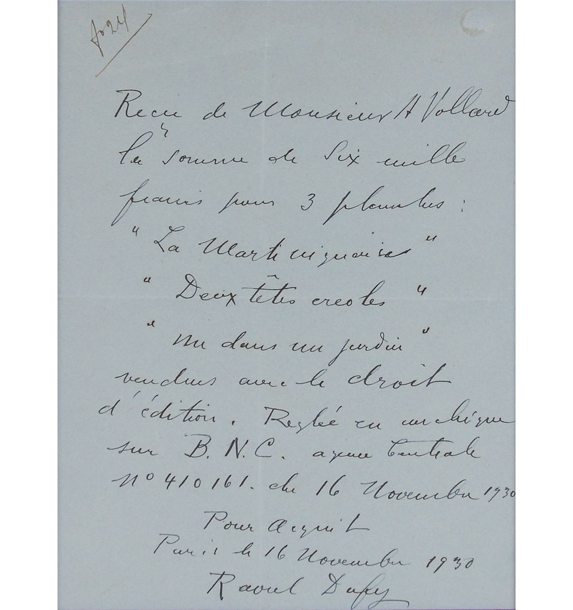 DS in French, one page, 5 x 6.75, November 16, 1930. Document concerning the rights to three of his works. In part (translated): “Received of Mr. A. Vollard the sum of 6000 francs for three plates: ‘La Martiniquaise,’ ‘Deux tetes creoles,’ ‘Nu dans un jardin,’ sold with the right of publication.” Double-matted and framed with a portrait to an overall size of 15 x 12.5. In fine condition, with central vertical and horizontal folds (one vertical fold passing through a single letter of the signature). Ambroise Vollard was an important French art dealer, collector, and publisher who sponsored the likes of Van Gogh, Cezanne, Picasso, and Rouault early in their careers. A fabulous artistic association mentioning three of his works, of which ‘La Martiniquaise’ is the most well-known.