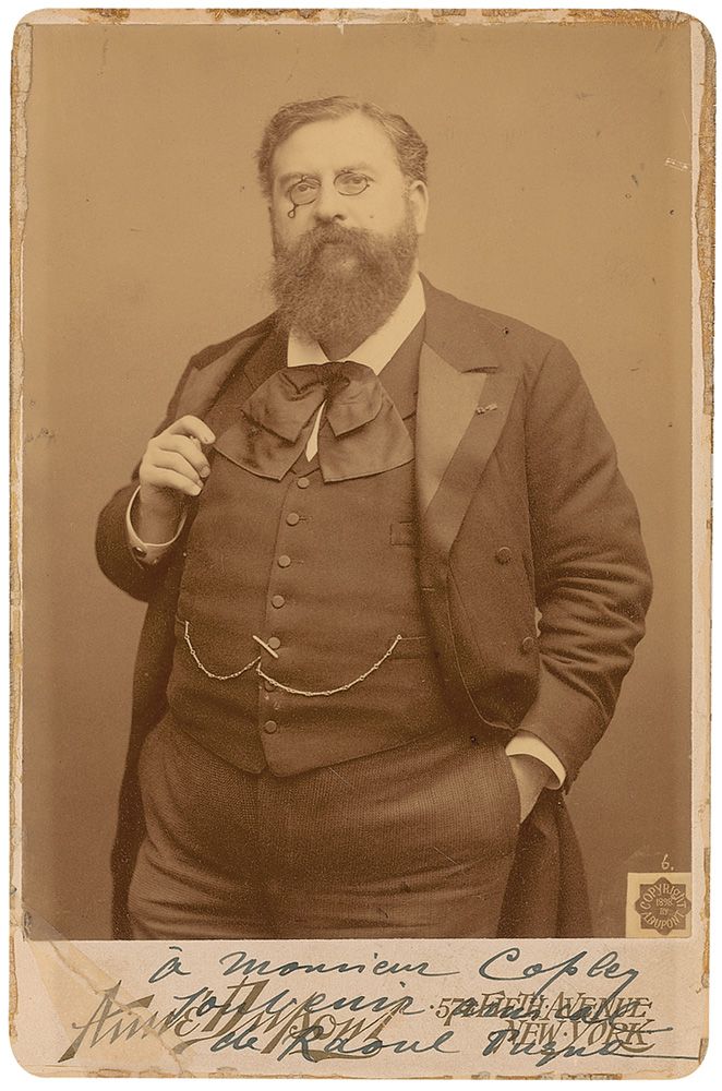 French composer and pianist (1852–1914) known for his performances of Mozart. Original 4.25 x 6.5 cabinet photo by Aime Dupont of New York, signed and inscribed in the lower border French in black ink. In very good condition, with adhesive remnants to the borders, the lower left corner separated and repaired with tape, and silvering to dark areas of the image.