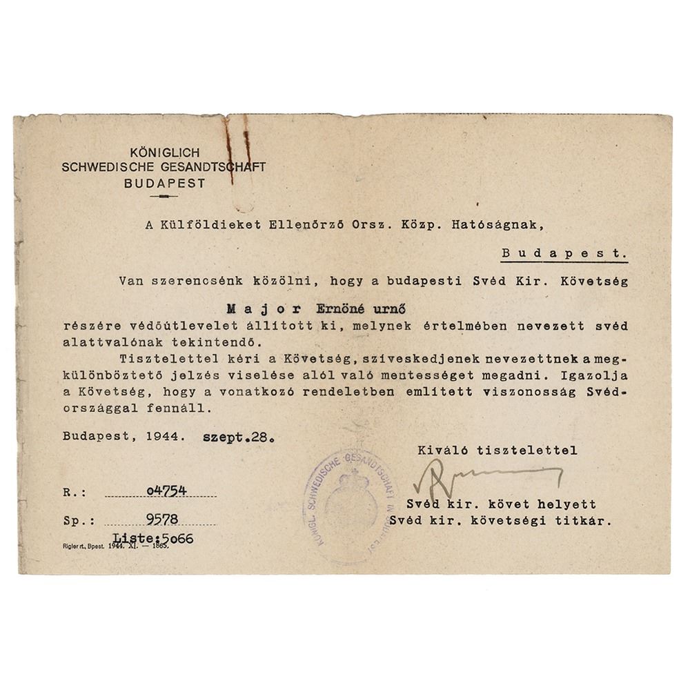 DS in Hungarian, signed “R. Wallenberg,” one page, 8.25 x 5.75, September 28, 1944. Document associated with the issuance of a Schutz-Pass, in part (translated): "To the National Central Authority Supervising Foreigners…We are pleased to inform you that the Royal Swedish Legation in Budapest has issued a protective passport to Miss Ernone Major according to which the above-named person must be considered a Swedish citizen. The Legation kindly requests that the above-named individual be exempt from wearing the distinguishing symbol. The Legation certifies that the reciprocity mentioned in the relevant regulation exists with Sweden." While Wallenberg typically signed Schutz-Passes with quick scribbles, this associated issuing document boasts a more complete signature. In fine condition, with a rusty paperclip impression to the top edge.
