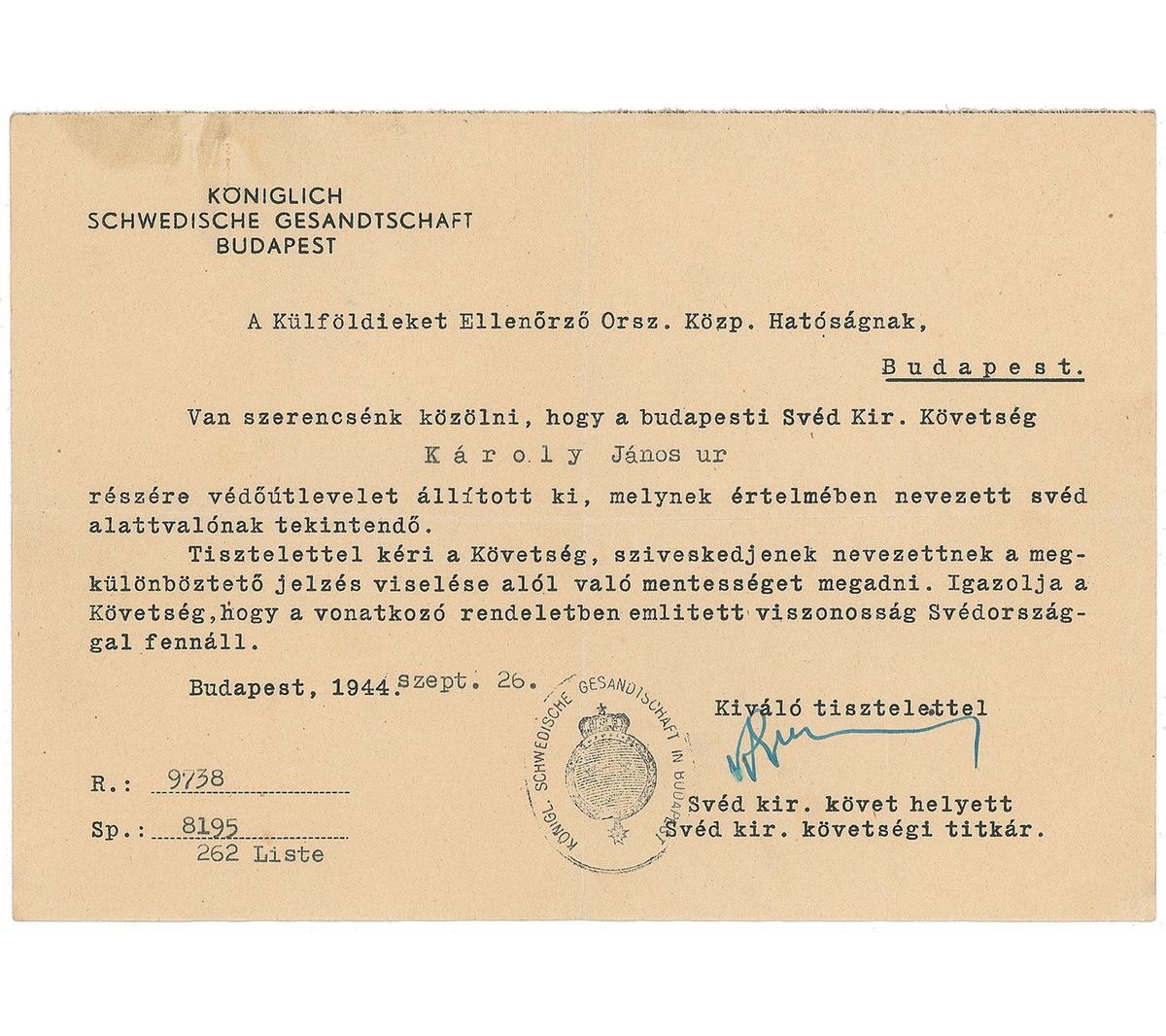Exceedingly rare DS, one page, 8 x 5.75, September 26, 1944. Document submitted to the National Central Authority for Control of Foreigners, Budapest. In full (translated): “We have the honor to let you know that the Royal Embassy of Sweden in Budapest has issued to Mr. Janos Karoly a Protection Passport in accordance to which the above named shall be considered a Swedish subject. The Embassy is respectfully requesting that the above named should be exempted to wear a distinctive insignia. The Embassy is certifying that a valid reciprocity with Sweden is in existence concerning the applicable ruling.” Stamped at the conclusion by the embassy with the Swedish coat of arms. In fine condition, with intersecting folds, mild overall creases, and an insignificant stain to the upper left.