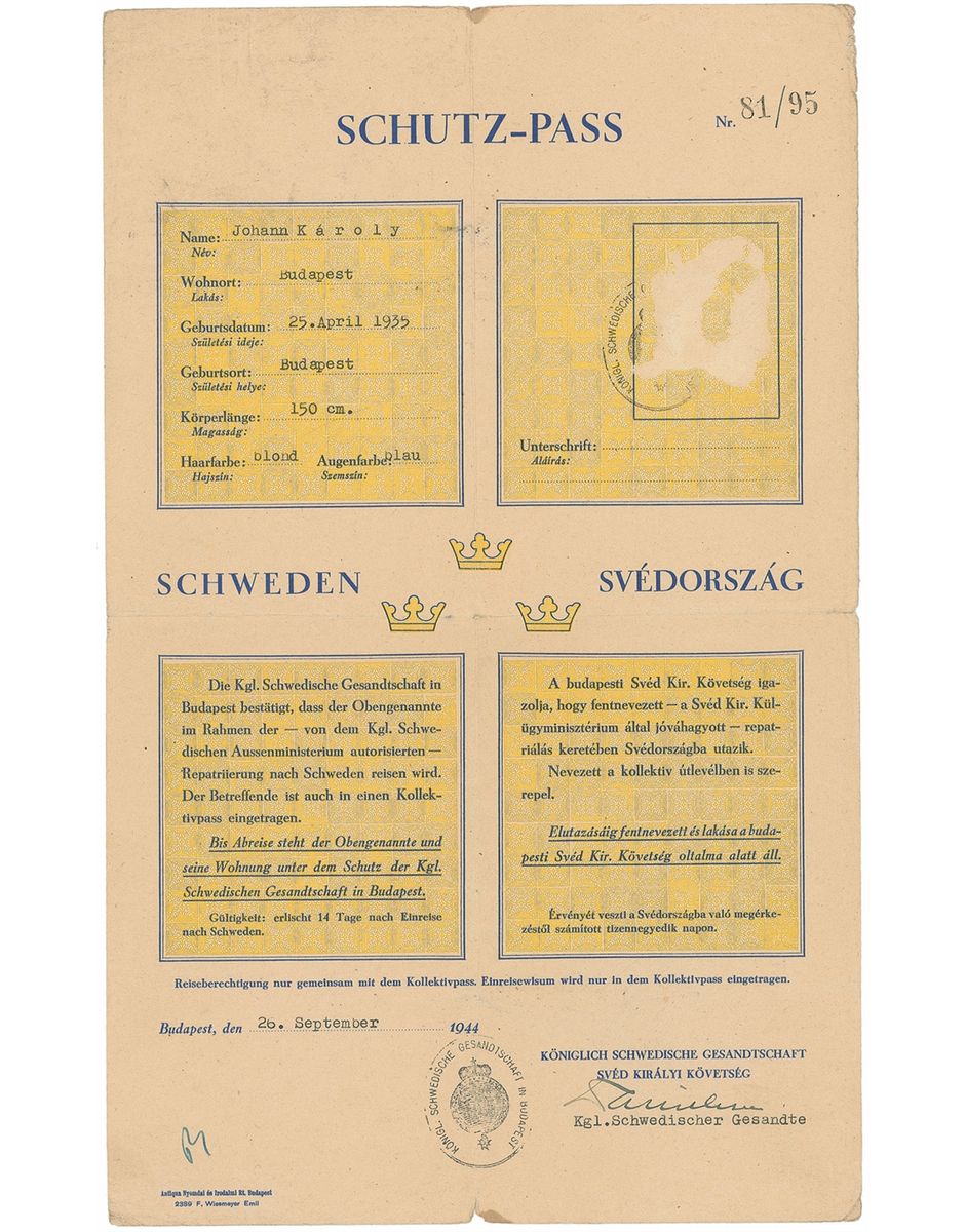 DS in German and Hungarian, quickly signed with an ink scribble (as typical on documents of this type), one page, 8.25 x 13.25, September 24, 1944. Blue and gold two-language Schutz-Pass issued to Johann Karoly. The upper left section is filled out in type with his personal information including his 1935 birth date, height, and eye and hair color. Adjacent to his personal information is an area where his photo would have been affixed. The bottom portion bears printed statements in German and Hungarian, hastily signed in the lower left corner by Wallenberg, and countersigned by Swedish Minister to Budapest Carl Ivan Danielsson. In very good condition, with tiny edge separations to central vertical and horizontal folds, light scattered soiling, and surface loss to the area where a photo was once affixed. A similar example of Wallenberg’s rushed signature can be found in the book Fleeing from the Fuhrer by William Kaczinski and Charmian Brinson.