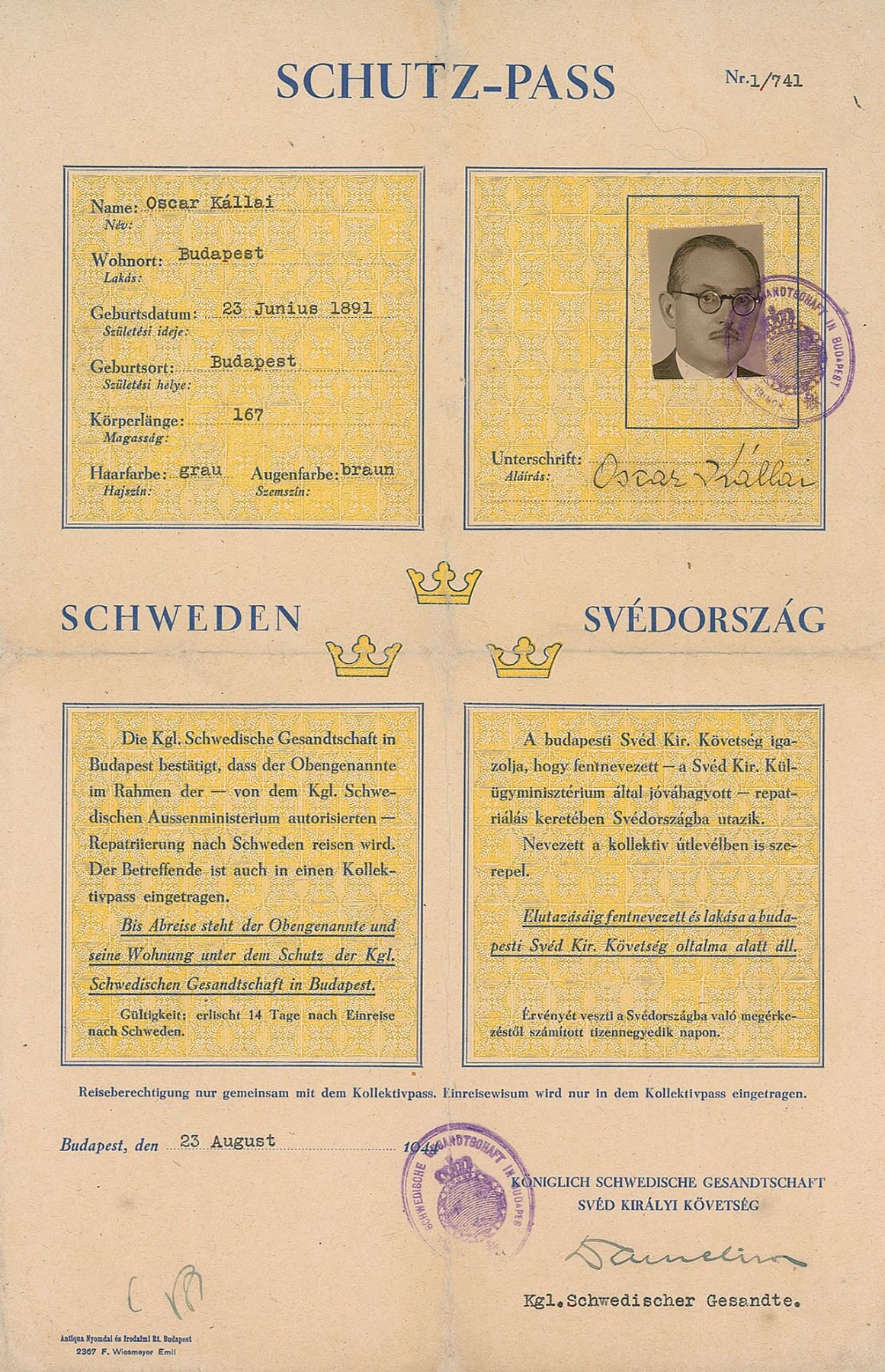 Scarce DS in German and Hungarian, quickly signed by Raoul Wallenberg with an ink scribble "R" (as he commonly did on documents of this type), one page, 8.25 x 13.25, August 23, 1944. A blue and gold two-language Schutz-Pass issued to Oscar Kallai, with the upper left providing personal information including his 1891 birth date, height, eye and hair color. Adjacent to this is Kallai’s signature and affixed photograph. The bottom portion bears printed statements in German and Hungarian, hastily signed in the lower left corner by Wallenberg, and countersigned by Swedish Minister to Budapest, Carl Ivan Danielsson. In very good to fine condition, with separations to the intersecting folds expertly restored. A similar example of Wallenberg's rushed signature can be found in the book Fleeing from the Fuhrer by William Kaczinski and Charmian Brinson. Wallenberg arrived in Hungary in July 1944 as the country's Jewish population was under siege. Nearly every other major Jewish community in Europe had already been decimated, and the Nazis were dispatching more than 10,000 Hungarian Jews to the gas chambers daily. With time of the essence, he devised and distributed thousands of these 'Schutz-Passes'—official-looking, but essentially invalid, Swedish passports granting the Hungarian bearer immunity from deportation. Nazi officials readily accepted the paperwork. Thus, with his simple, nondescript scribble on this offered page, Wallenberg saved the life of Oscar Kallai—just as he had done with tens of thousands of other Jews in Hungary. An announcement that any Jew, even those holding foreign citizenship, would be interred led to the urgency of Wallenberg's plan to save as many lives as he could.