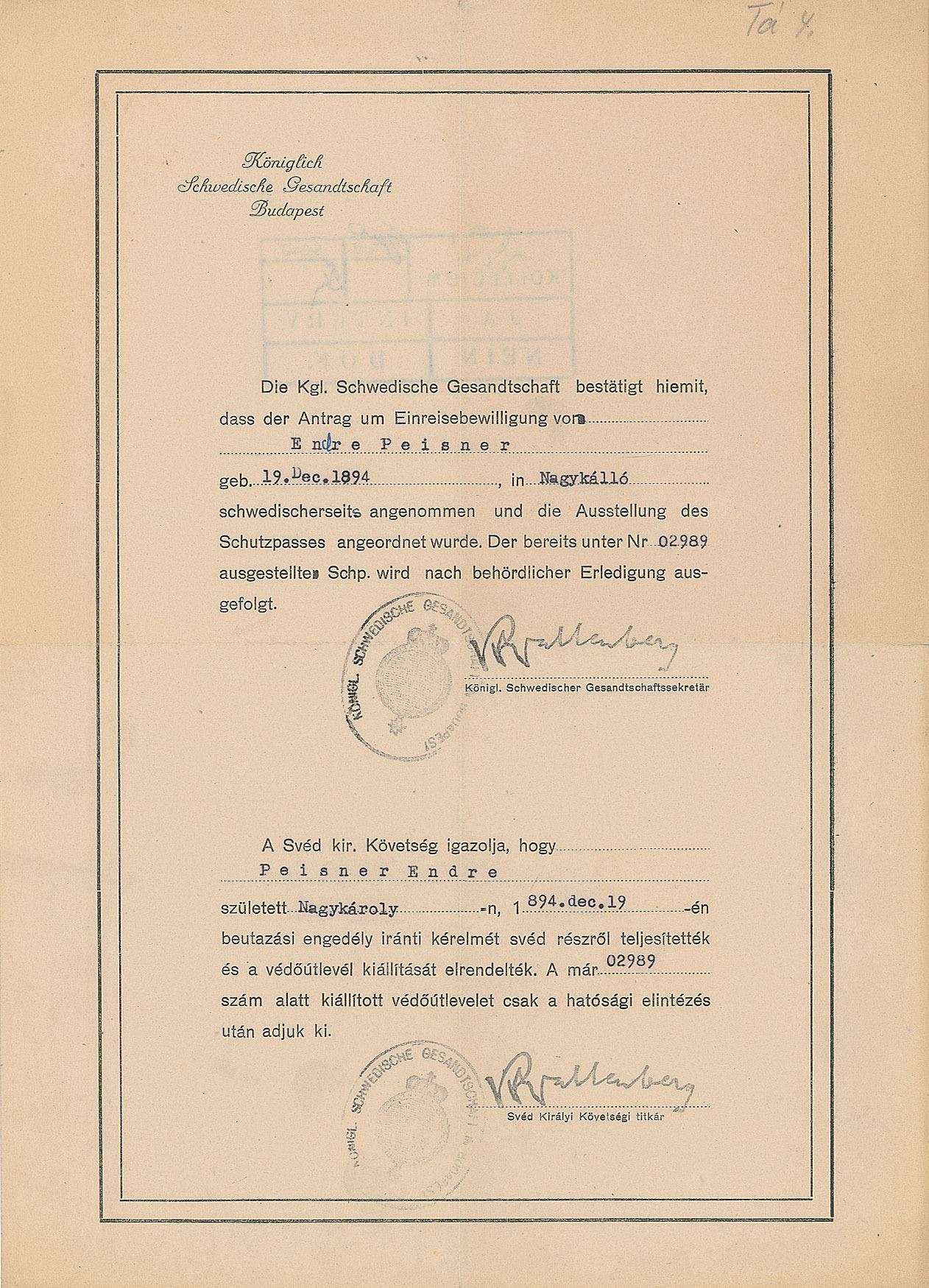 Uncommon document in German and Hungarian, bearing two stamped signatures of Wallenberg, one page, 8 x 11.25, no date. Two-language document confirming the application for entry clearance by Endre Peisner for the issuance of a "Schutzpass," bearing stamped signatures at the conclusion of each section. In fine condition, with central vertical and horizontal folds.