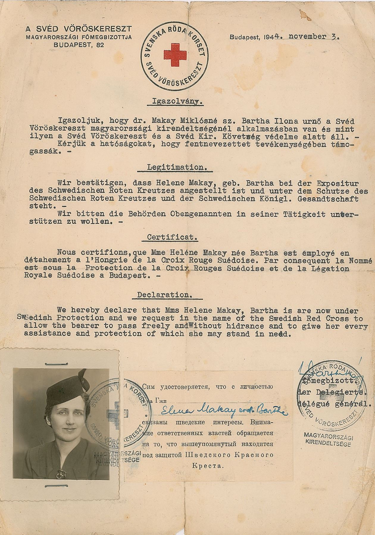 Uncommon document in Hungarian, German, French, and English, signed by a Swedish official, one page, 8.25 x 11.5, November 3, 1944. Four-language document issued by the Swedish Red Cross at Budapest, ordering the protection of Elena Makay, in part (translated): "We hereby declare that Ms. Helene Makay née Bartha is now under Swedish Protection and we request in the name of the Swedish Red Cross to allow the bearer to pass freely and without hindrance and to give her every assistance and protection." A photo of her is stapled to the lower left, and the document is signed over a black ink stamp to the lower right. In very good condition, with intersecting folds, small edge tears, and light scattered staining.