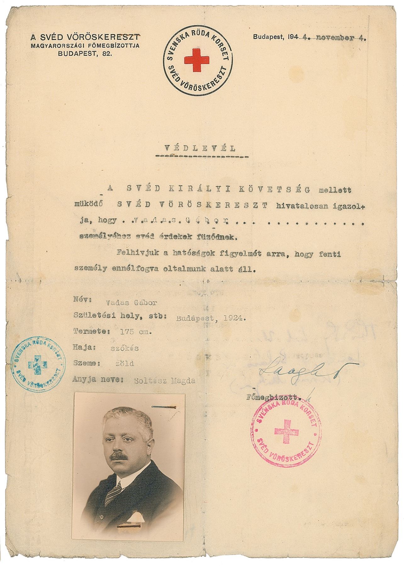 Uncommon document in Hungarian, signed by a Swedish official, one page, 8.25 x 11.5, November 4, 1944. Document issued by the Swedish Red Cross at Budapest, ordering the protection of Gabor Vadas, listing his personal information such as height, hair and eye color, and mother's name, and bearing a photo of him stapled to the lower left. The document is signed in the lower right corner by an official, and bears blue and red ink stamps. In very good condition, with central vertical and horizontal folds and small edge tears.