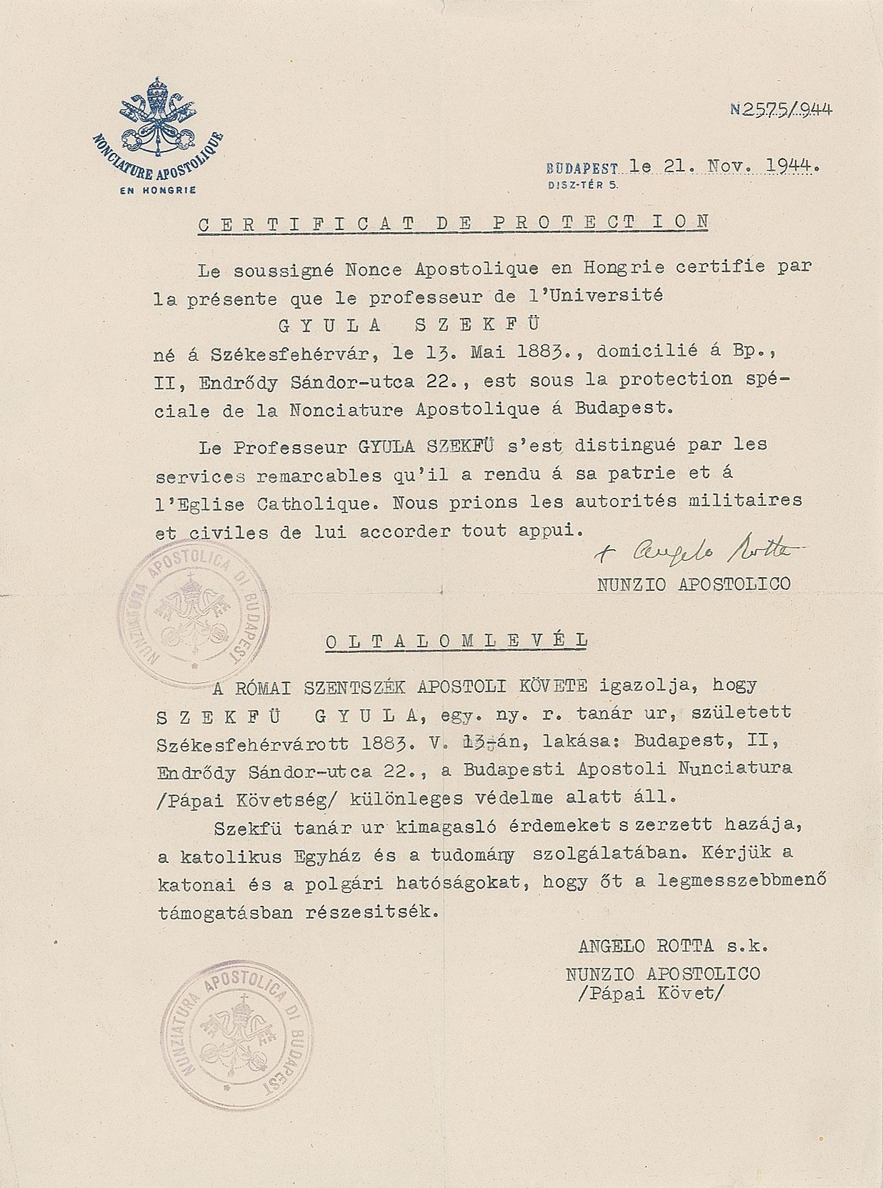 DS in French and Hungarian, signed "Angelo Rotta," one page, 8 x 10.75, November 21, 1944. Document issued by the Vatican's Apostolic Papal Nuncio in Budapest, providing for the protection of Gyula Szekfu. In part (translated): "Prof. Gyula Szekfu distinguished himself by the remarkable services he rendered to his homeland and to the Catholic Church. We urge the military and civilian authorities to give him all support." In fine condition. Like Wallenberg, Rotta was deeply involved in the rescue of the Jews of Budapest, and was an important figure in the Catholic resistance to Nazism.
