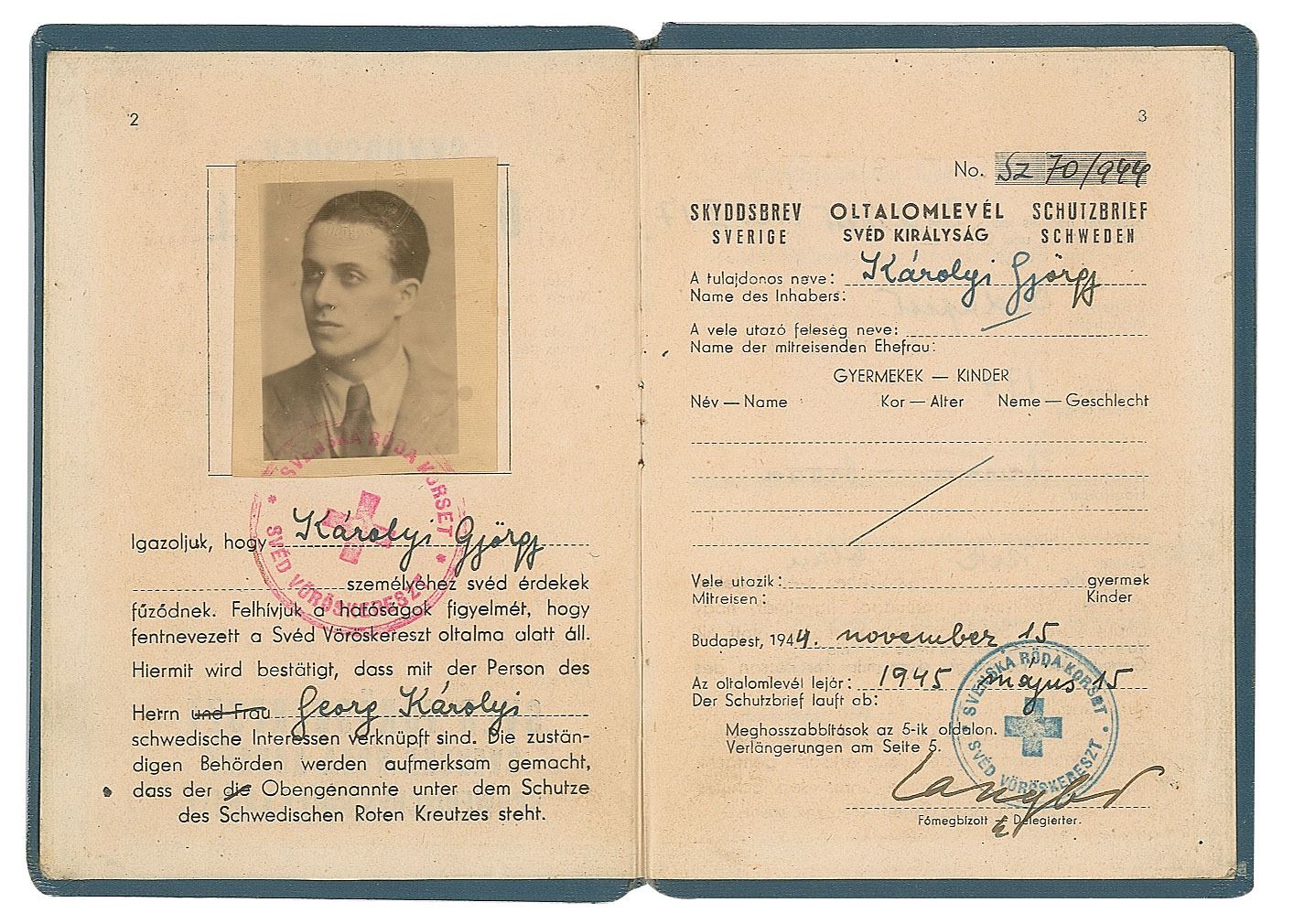 Rare hardcover multilingual passport booklet issued by the Swedish Red Cross, marked "Skyddsbrev, Oltalomlevel, Schutzbrief" on the front, 4.26 x 6, issued to Gjorgi Karolyi on November 15, 1944. The passport features Karolyi's portrait inside, and is filled out with his personal information such as a birth date, height, and hair and eye color. In very good to fine condition, with edgewear.