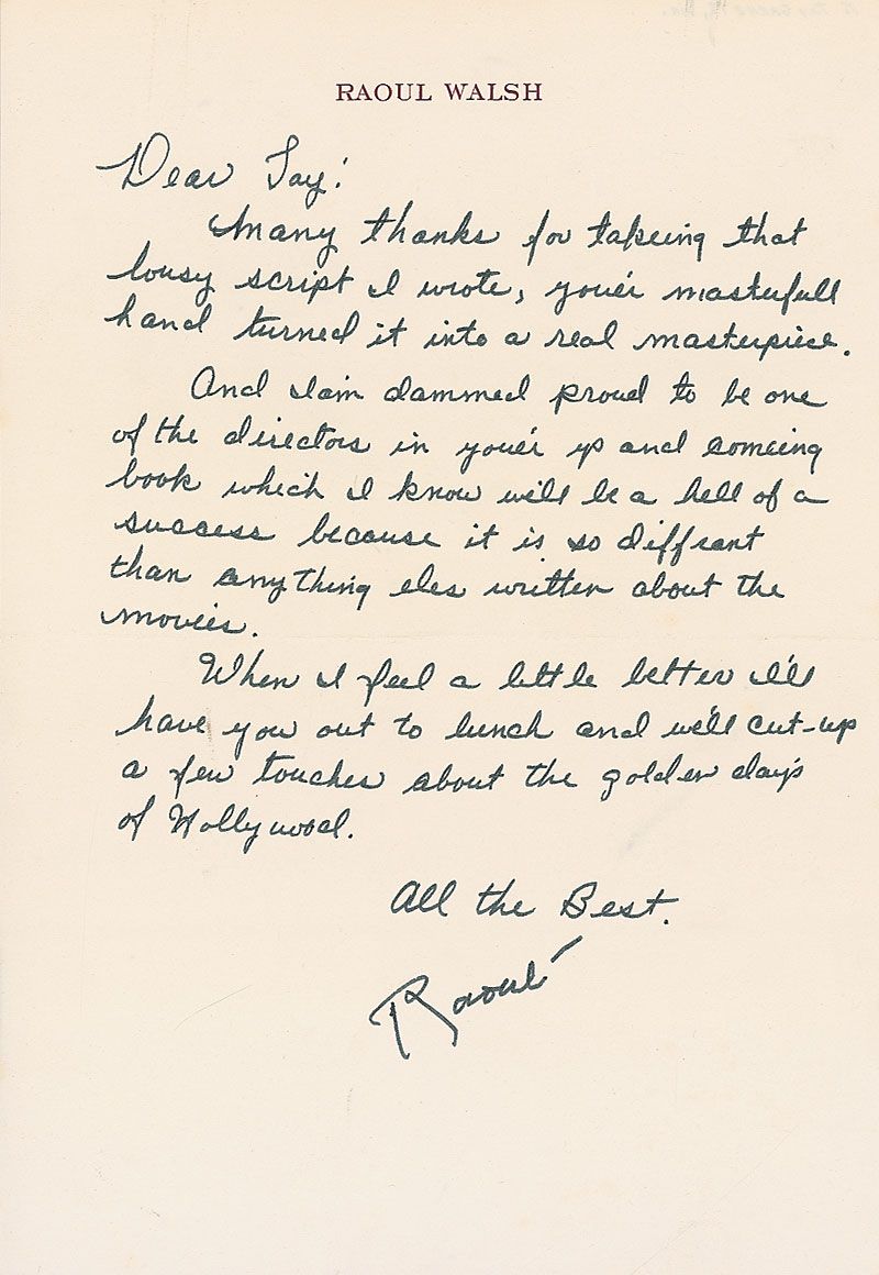Distinguished American actor and film director (1887–1980) who helmed such action and suspense classics as The Roaring Twenties, They Drive by Night, and White Heat. LS signed “Raoul,” one page, 7.25 x 10.5, personal letterhead, no date. Letter to Tay Garnett about the 1970 film The Delta Factor. In part: “Many thanks for taking that lousy script I wrote, your masterful hand turned it into a real masterpiece.” In fine condition, with a paperclip impression to the top.