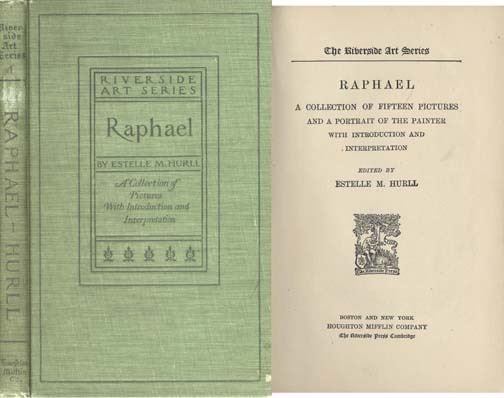 ''Raphael'' by Estelle M. Hurll. Boston and New York: Houghton Mifflin Company: 1899. The Riverside Art Series. First edition octavo book runs 92pp. ''A Collection of Fifteen Pictures and a Portrait of the Painter with Introduction and Interpretation''. Features 16 black and white reproductions of Raphael's greatest works, including: ''The Liberation of Peter'', ''Parnassus'' and ''Abraham and the Three Angels''. Minor rubbing to green cloth boards and small tear to front free endpaper, overall very good.