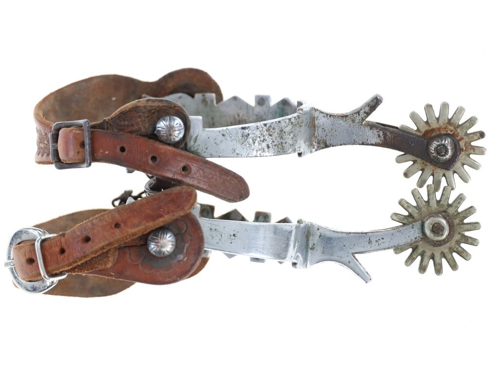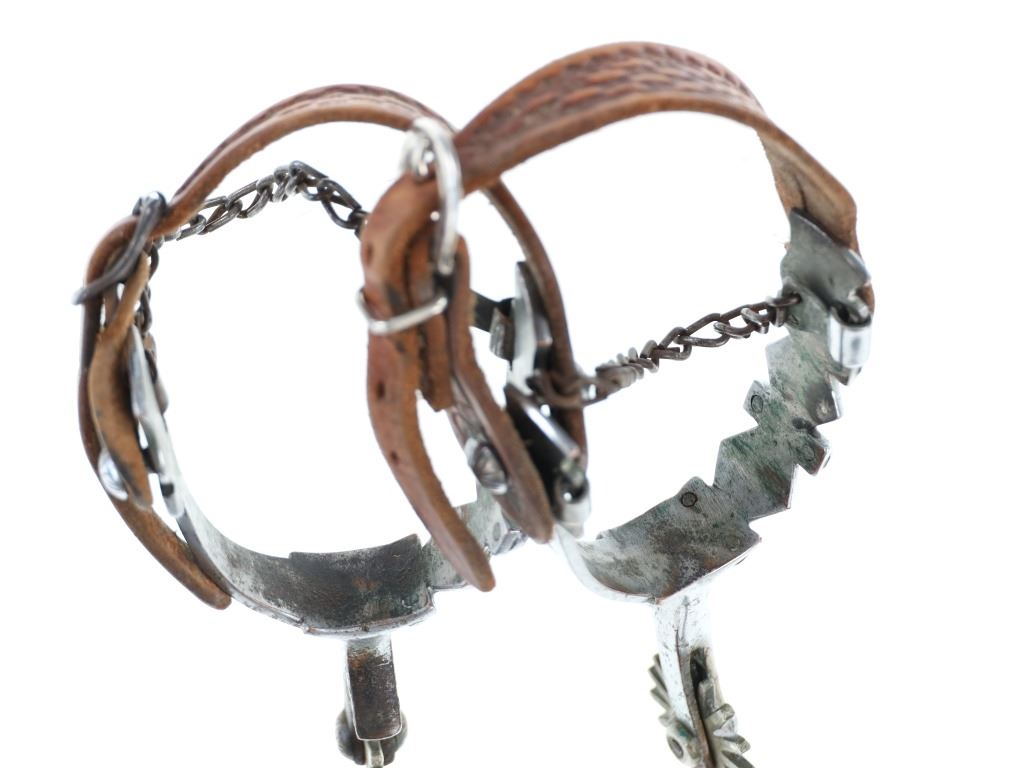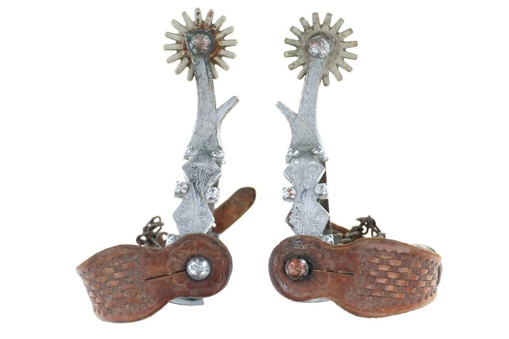 The lot features a set of spurs bought from Hamley Saddlery in Pendleton, Oregon in 1948 in the exact pattern of a Raphael (Filo) Gutierrez spurs. The set shows a double diamond pattern, scalloped heelbands, multiple domes and deep stylish engravings with swinging buttons and wonderful larger rowels with feathered tips. The spurs have a silver adn copper coloring with nickel rowels. The spurs were puchased from Hamley Saddlery in Pendleton, Oregon as an anniversary present in 1948. These spurs are in the exact pattern of the Gutierrez Spurs sold by New Frontier Western Show & Auction in their July 2020 sale (picutre in photo gallery for reference). The spurs are not marked. Each has a basketweave and floral tooled spur straps. The spurs are metal with a silver colored overlay and copper adornments. Likely by the same hand or shop as the Gutierrez spurs, but not marked. Each spur measures 9-inches long from the rowel to back of the spur straps by 4.5-inches wide.