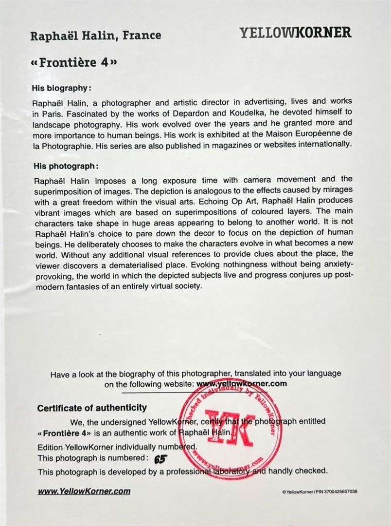 Raphael Halin France Frontiere 4 YellowKorner Certified Photograph. Certificate of Authenticity from YellowKorner affixed to the back. Matted Dimensions 16"x20". Protected with Clear Mylar Sleeve.