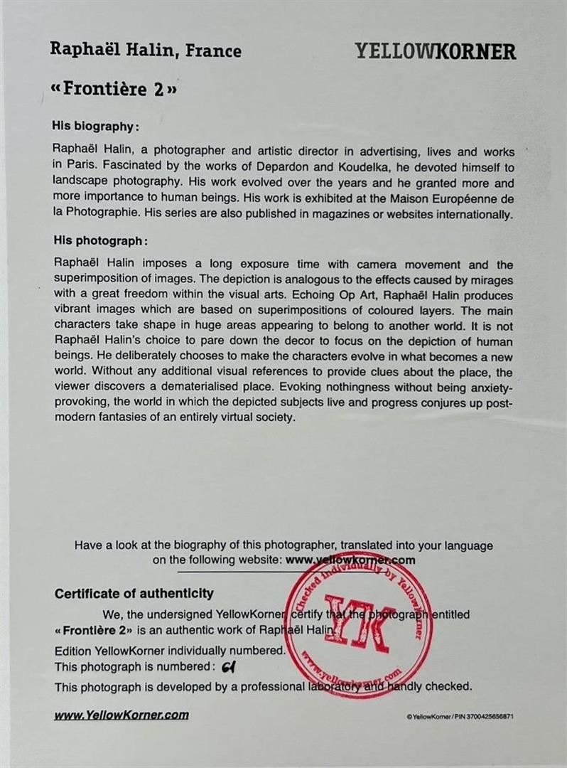Raphael Halin France Frontiere 2 YellowKorner Certified Photograph. Certificate of Authenticity from YellowKorner affixed to the back. Matted Dimensions 16"x20". Protected with Clear Mylar Sleeve.