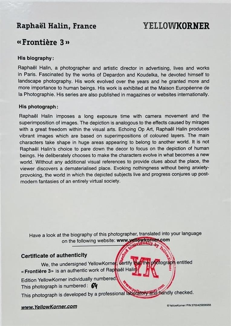 Raphael Halin France Frontiere 3 YellowKorner Certified Photograph. Certificate of Authenticity from YellowKorner affixed to the back. Matted Dimensions 16"x20". Protected with Clear Mylar Sleeve.