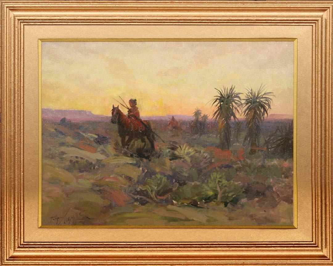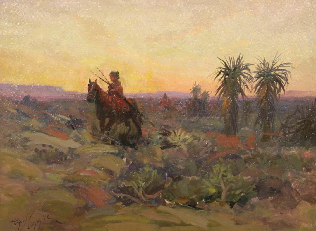 Raphael Lillywhite (1891-1958). Moving Camp, 1944. 22" x 29" oil on canvasboard. Signed lower left. (est $3,000-5,000). For condition reports please visit: www.auctioninsantafe.com/cr2011.pdf