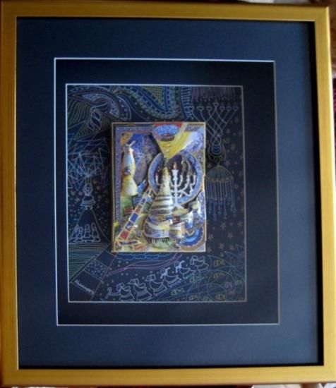 MENORAH is a multi-layered papercut - Decoupage. This fabulous art piece is crafted out of multiple layers of skillfully arranged cut paper, making it completely unique and one-of-a kind. This three-dimensional treasure is displayed in a gorgeous gold shadow box frame with black matting that brings out the gorgeous brilliant colors.