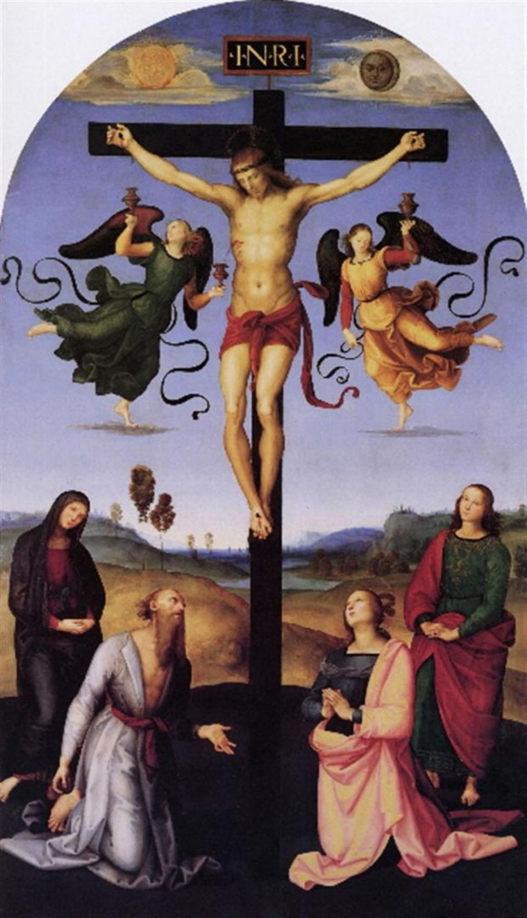 Artist: Raphael - Title: Mond Crucifixion - Medium: Fine Art Giclee on Canvas - Image Size: Approximately 32 inches x 18.5 inches - Unframed on Unstretched Canvas - Biography: Raffaello Sanzio da Urbino (c. March 28 or April 6, 1483 - April 6, 1520), also known as Raphael, was an Italian painter and architect of the High Renaissance. His work is admired for its clarity of form, ease of composition, and visual achievement of the Neoplatonic ideal of human grandeur. Together with Michelangelo and Leonardo da Vinci, he forms the traditional trinity of great masters of that period.