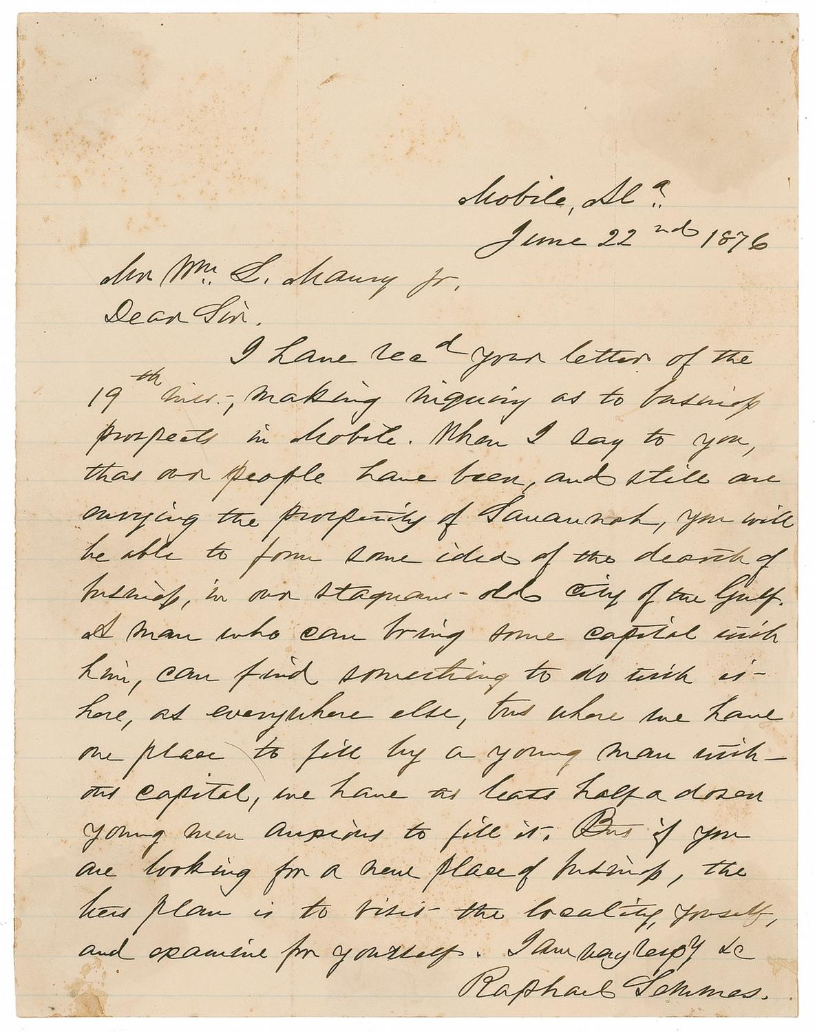 Confederate naval commander who was captain of the famous commerce raider CSS Alabama, taking a record 69 prizes. ALS, one page, lightly-lined, 7.75 x 10, June 22, 1876. Letter to Mr. L. Maury Jr. In full: “I have rec’d your letter of the 19th inst, making inquiry as to the business prospects in Mobile. When I say to you that our people have been, and still are envying the prosperity of Savanah, you will be able to form some idea of the dearth of business, in our stagnant old city of the Gulf. A man who can bring some capital with him, can find something to do with it here, as everywhere else, … where we have one place to fill by a young man without capital, we have at least half a dozen young men anxious to fill it. But if you are looking for a new place of business, the best plan is to visit the locality yourself, and examine for yourself.” In very good condition, with intersecting folds, one through a single letter of signature, scattered toning and foxing, and mounting remnants to reverse.