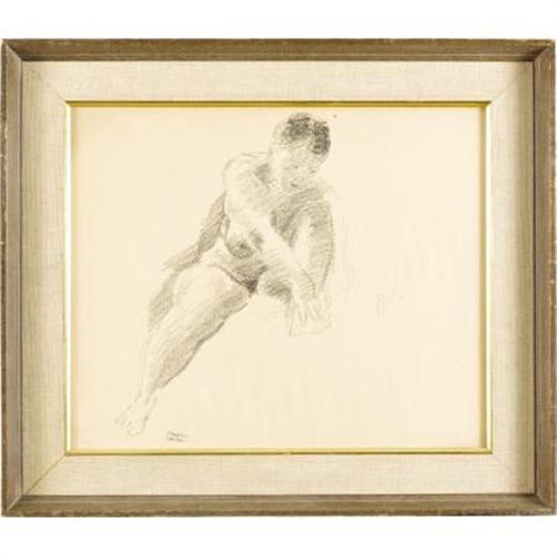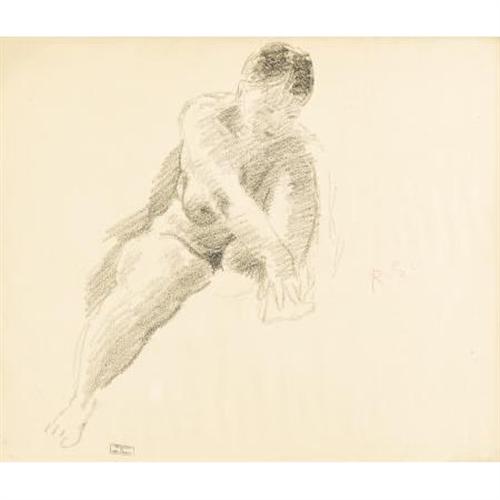 <B>RAPHAEL SOYER (American, 1899-1987)</B></I><BR><I>Seated Nude</B></I><BR>Charcoal on paper<BR>13-1/2 x 16-1/2 inches (34.3 x 41.9 cm)<BR>Initialed lower right: <I>R.S.</B></I><BR> <BR>PROVENANCE:<BR>Collection of Emil J. Arnold (stamp at lower left)<BR><B>Condition Report:</B> Minor toning. Not examined out of frame.<BR><BR><b>Shipping:</b> Framed - with Glass, Small (<a target="_blank" href="http://www.heritageauctions.com/common/shipping.php">view shipping information</a>)