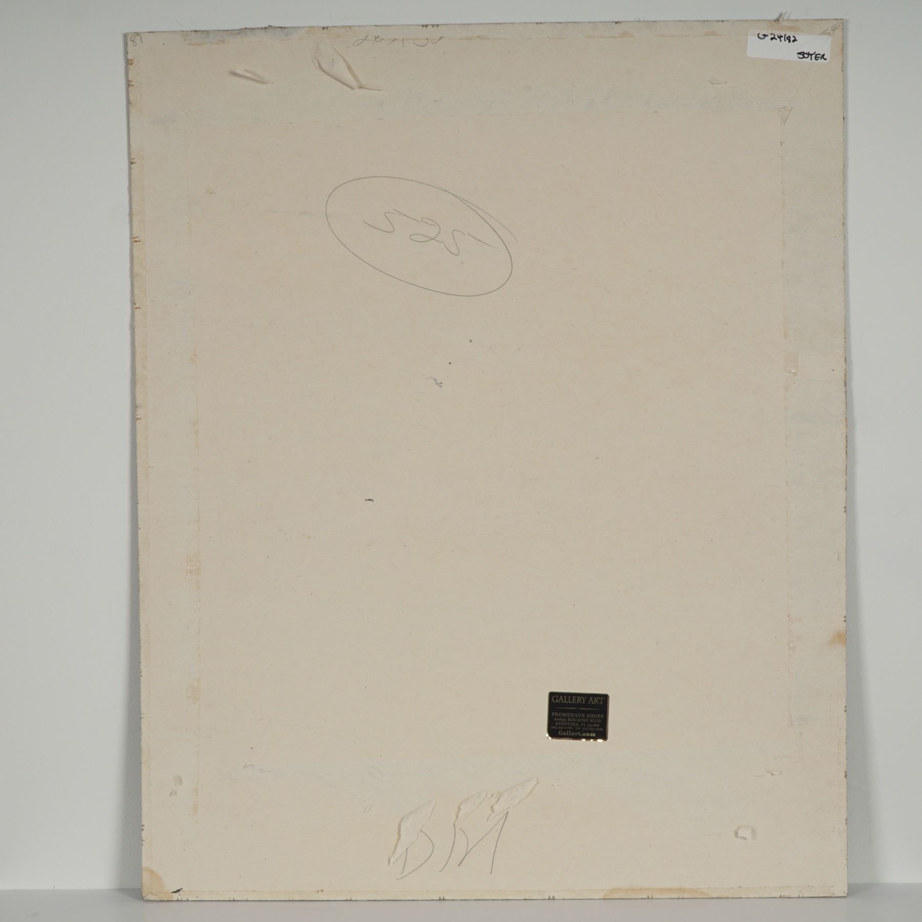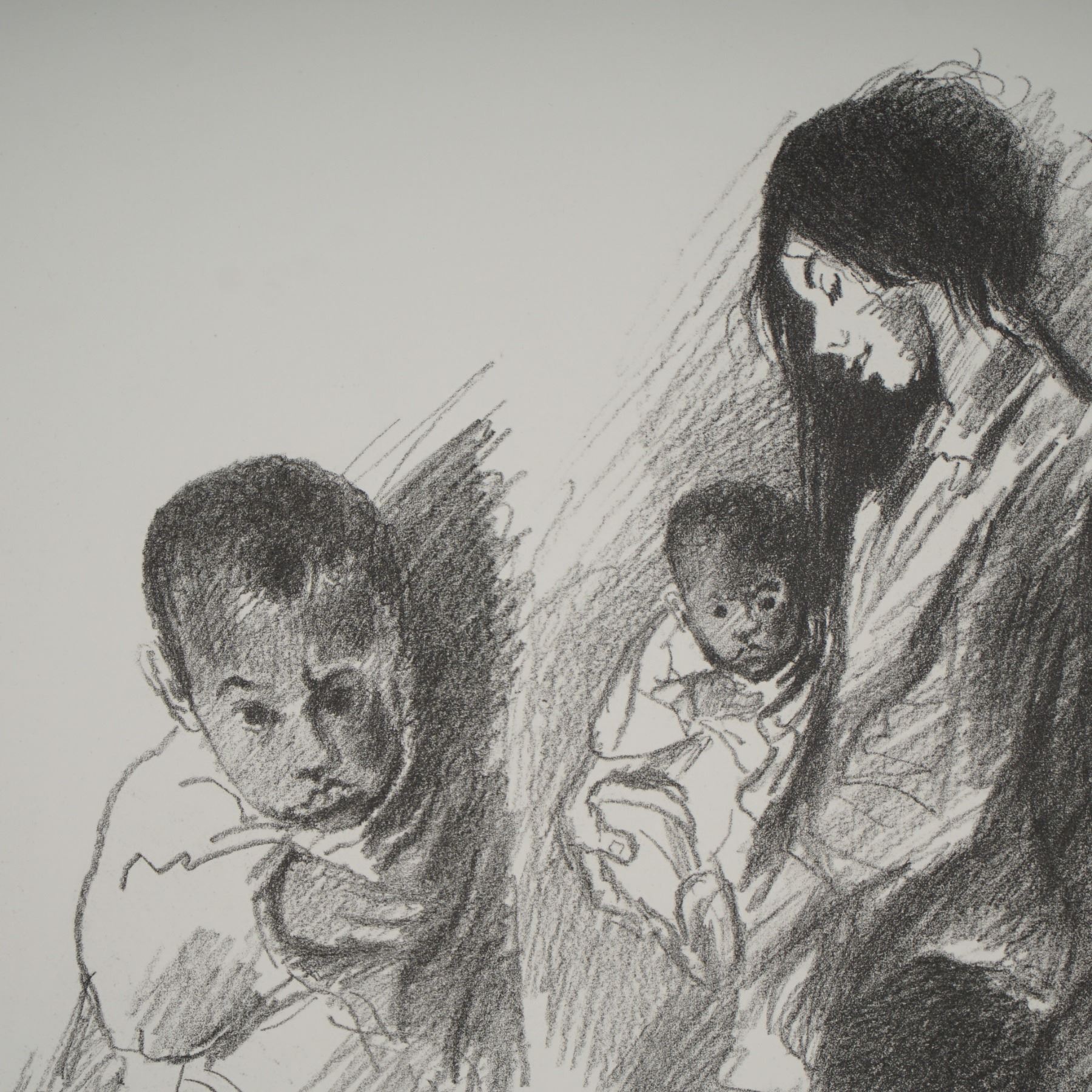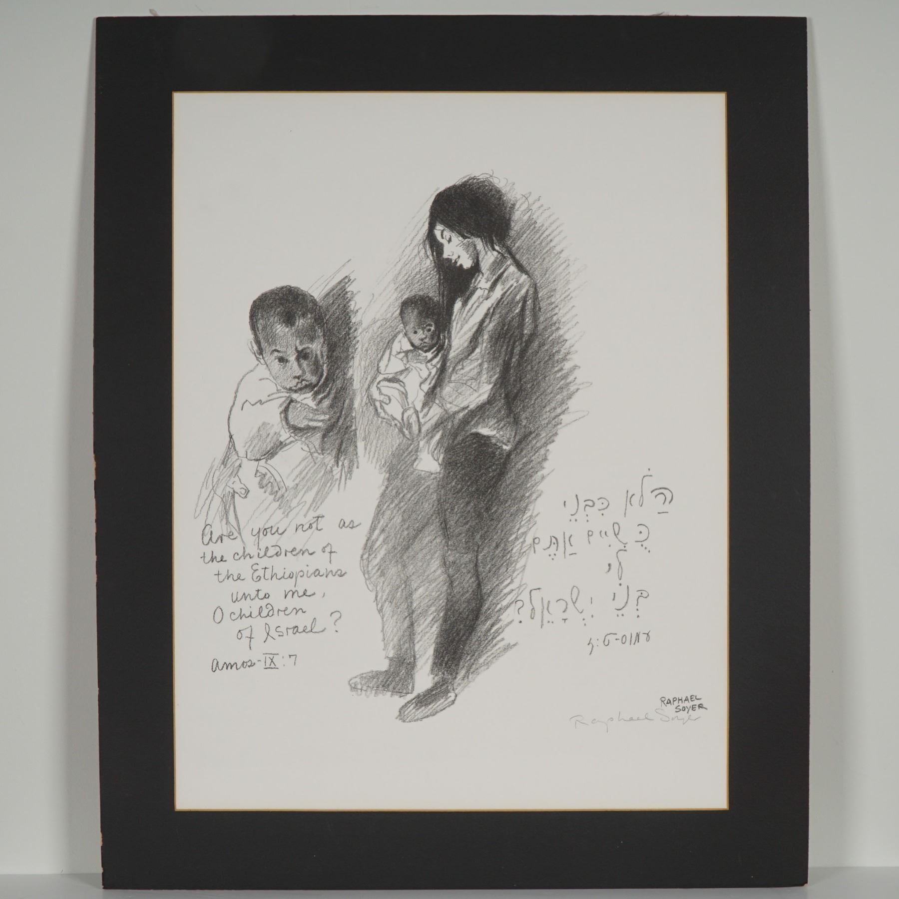 Striking black and white lithograph on paper by noted American social realist artist Raphael Soyer (1899-1987), signed in graphite at lower right. The composition features a tender scene of a standing woman cradling a child, with a young boy to her left. The artwork is further enriched by a handwritten passage from the Book of Amos (IX:7), rendered in both English and Hebrew: "Are you not as the children of the Ethiopians unto me, O children of Israel?" Executed in expressive, gestural lines, this print exemplifies Soyer's enduring empathy for the human condition and his deeply personal interpretation of social themes. Professionally matted.
