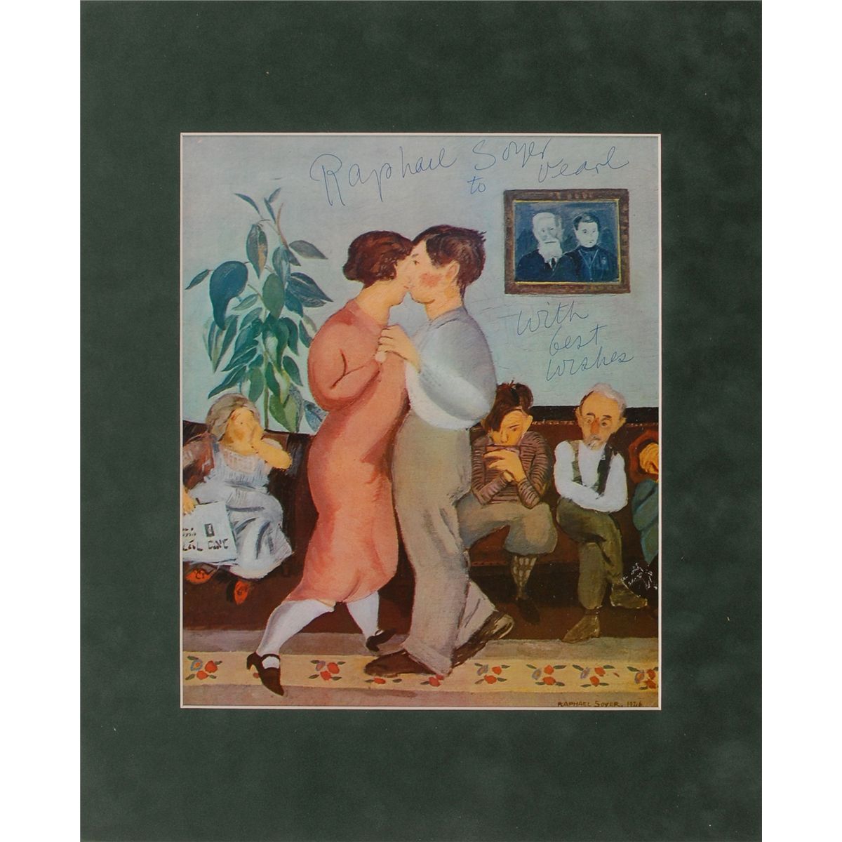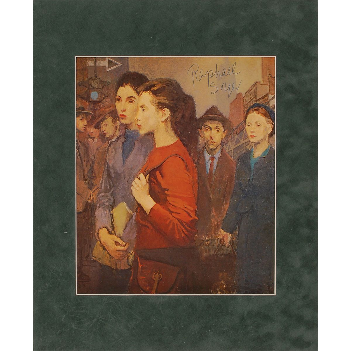 Two different color 9 x 10.75 book photos of Soyer’s works, each signed in blue ballpoint, with Soyer inscribing one of the photos. Both are individually suede matted to overall sizes of 13 x 16. In fine condition.