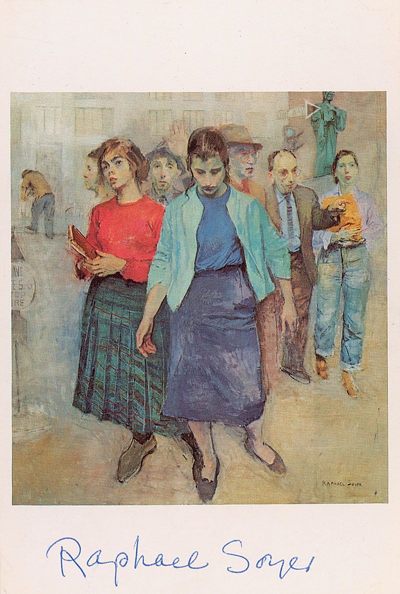 Two color postcards of Soyer’s works entitled ‘The Brown Sweater,’ and ‘Farewell to Lincoln Square,’ both approximately 4 x 6, each signed in the lower border in blue ballpoint. In fine condition.