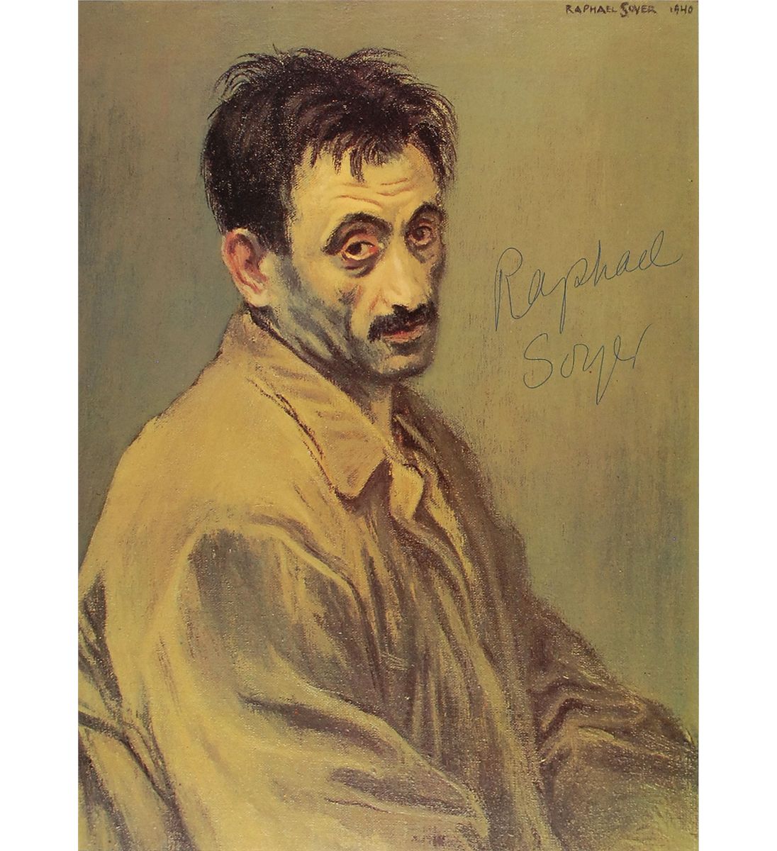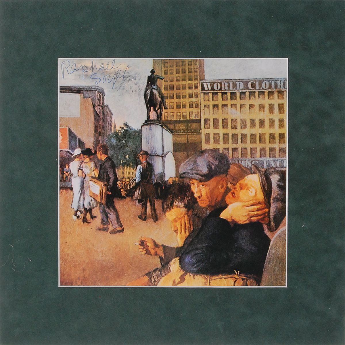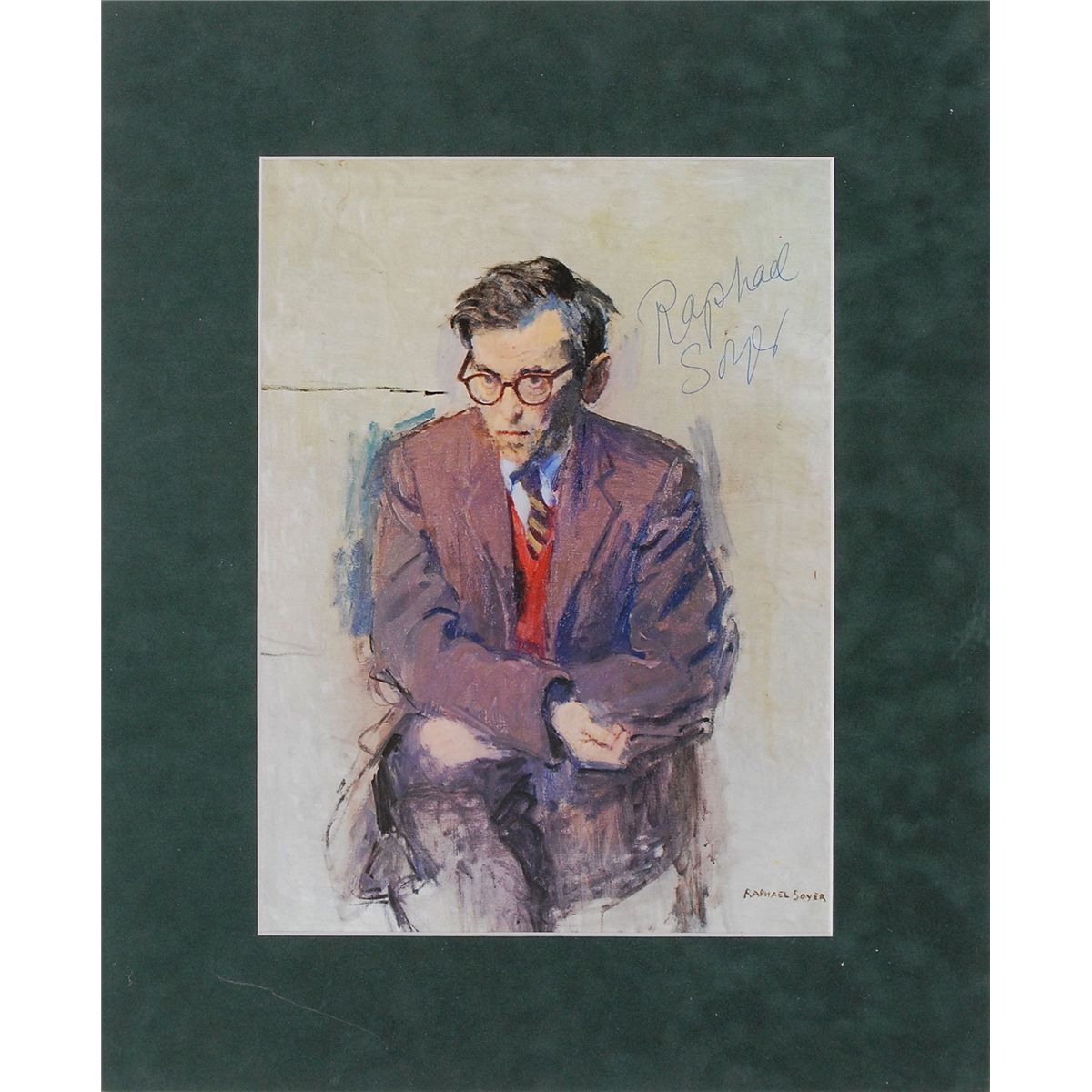 Collection of five items: four color prints of Soyer’s works, various sizes, each signed in blue felt tip and individually matted; and a color 4 x 6 postcard of Soyer’s Farewell to Lincoln Square, also signed in blue ballpoint. In overall fine condition.