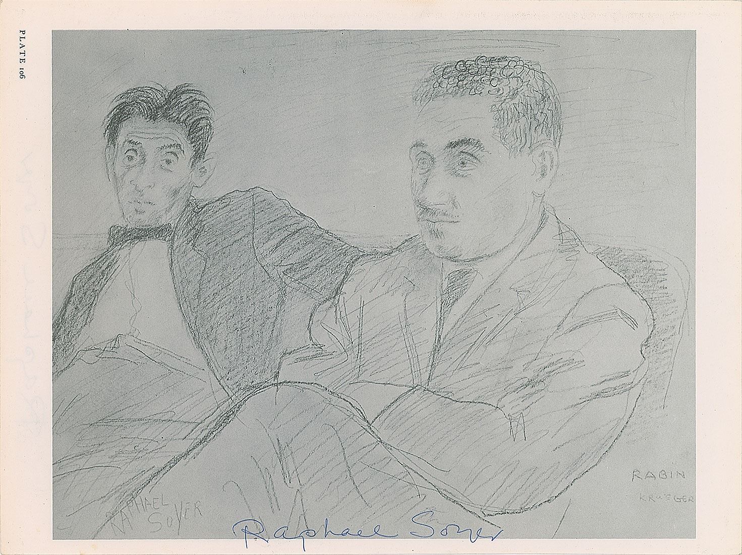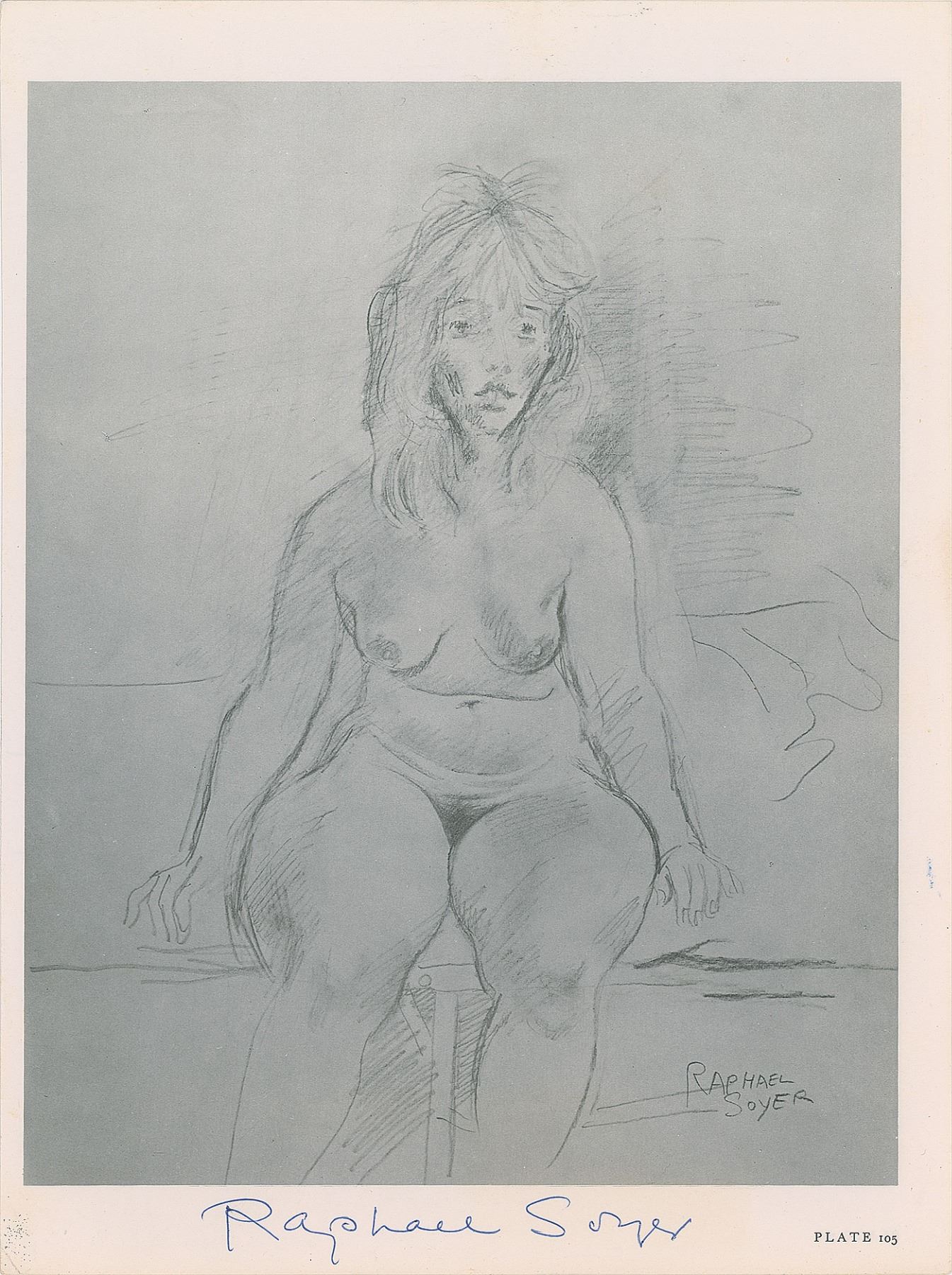 Appealing dual-sided 8.25 x 11 book photo signed both on the front and reverse in blue ballpoint by Raphael Soyer. The vertical front image, issued as plate 105, depicts a sketch of a nude woman seated on a bed or cot; the horizontal reverse image, plate 106, shows a sketch of noted art collectors Bernard Rabin and Nathan Krueger. In fine condition.