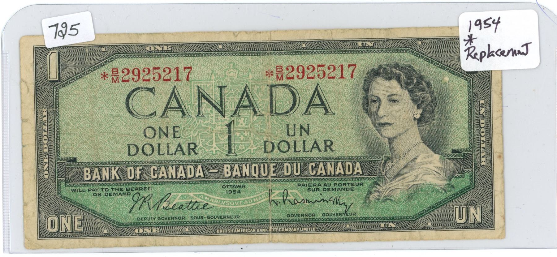 Raplacement bill serial #*B/M 2925217, canada 1954 $1, beattie/ Rasminsky