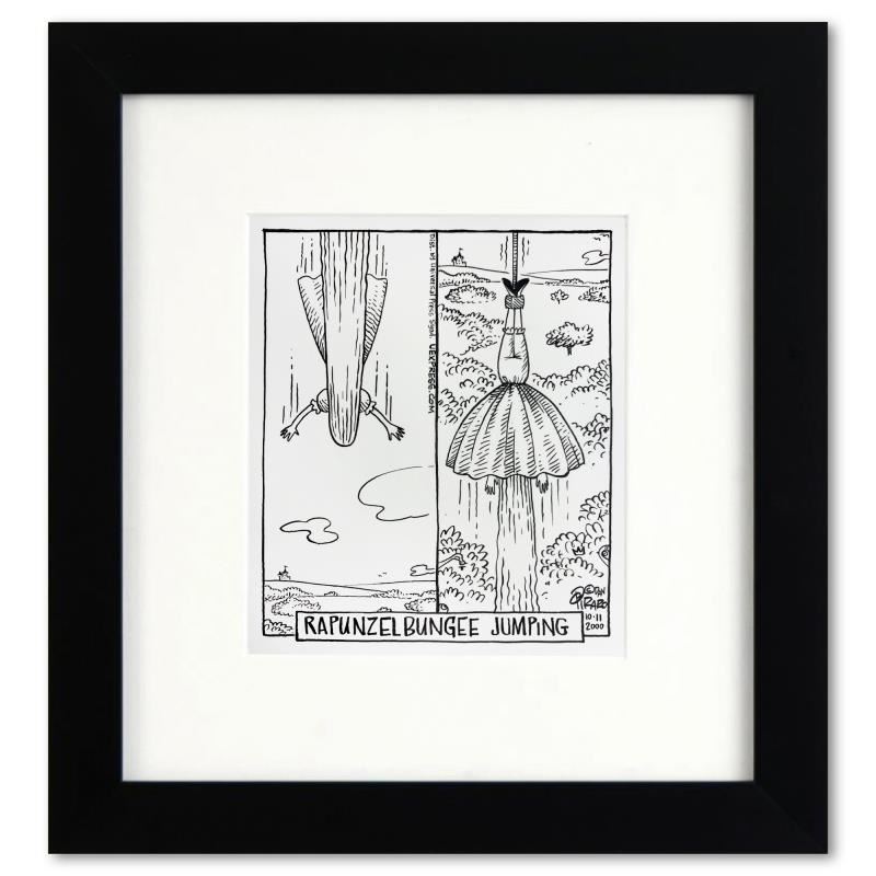Enter a surreal and satirical world of twisted imagination and award winning creativity. "Rapunzel Bungee Jumping" is an original pen & ink drawing on paper by Dan Piraro, creator of the critically acclaimed and award winning comic strip, Bizarro. This piece is hand signed, comes custom framed and includes a letter of authenticity. Measures approximately 12" x 11" (frame), 7" x 6" (image).This item requires special handling and may have a longer than usual turnaround.