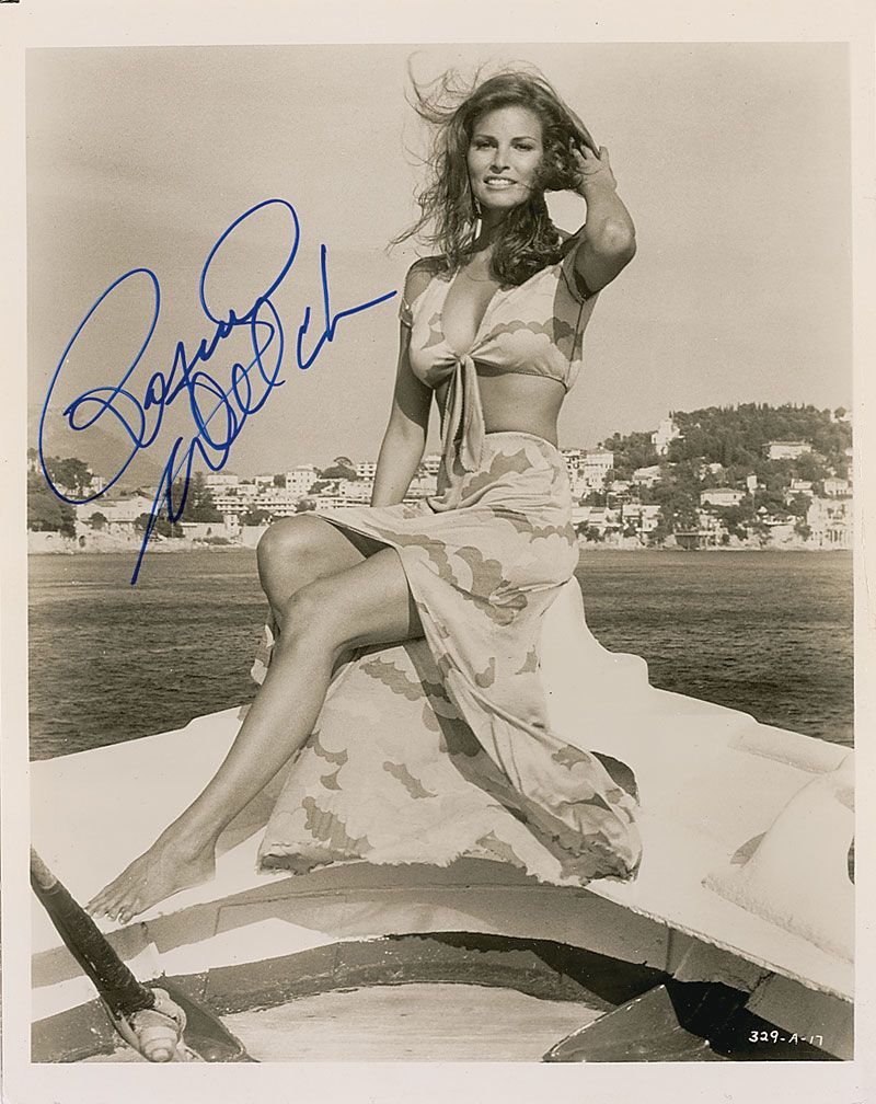 Glossy 8 x 10 photo of Welch sitting on the bow of a boat, signed in blue felt tip. In fine condition.