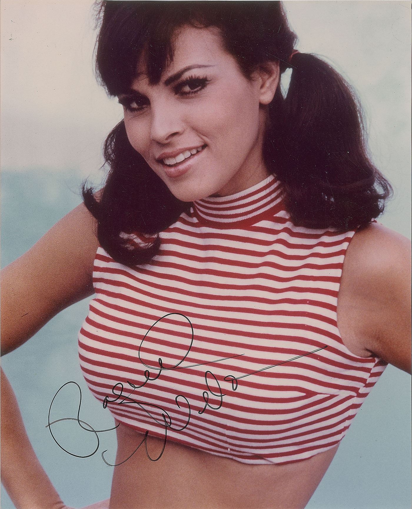 Color glossy 8 x 9.75 photo of Welch in a striped crop top, signed in black felt tip. In fine condition. From the Harvey and Rhoda Kuflik Collection.