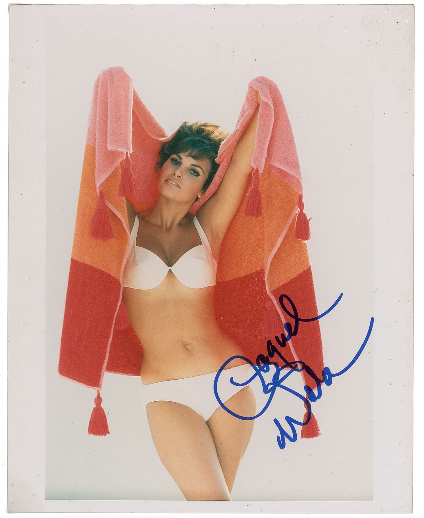 Color glossy 8 x 10 photo of Raquel Welch wearing a white bikini and holding a large beach towel, signed in blue felt tip. In fine condition.