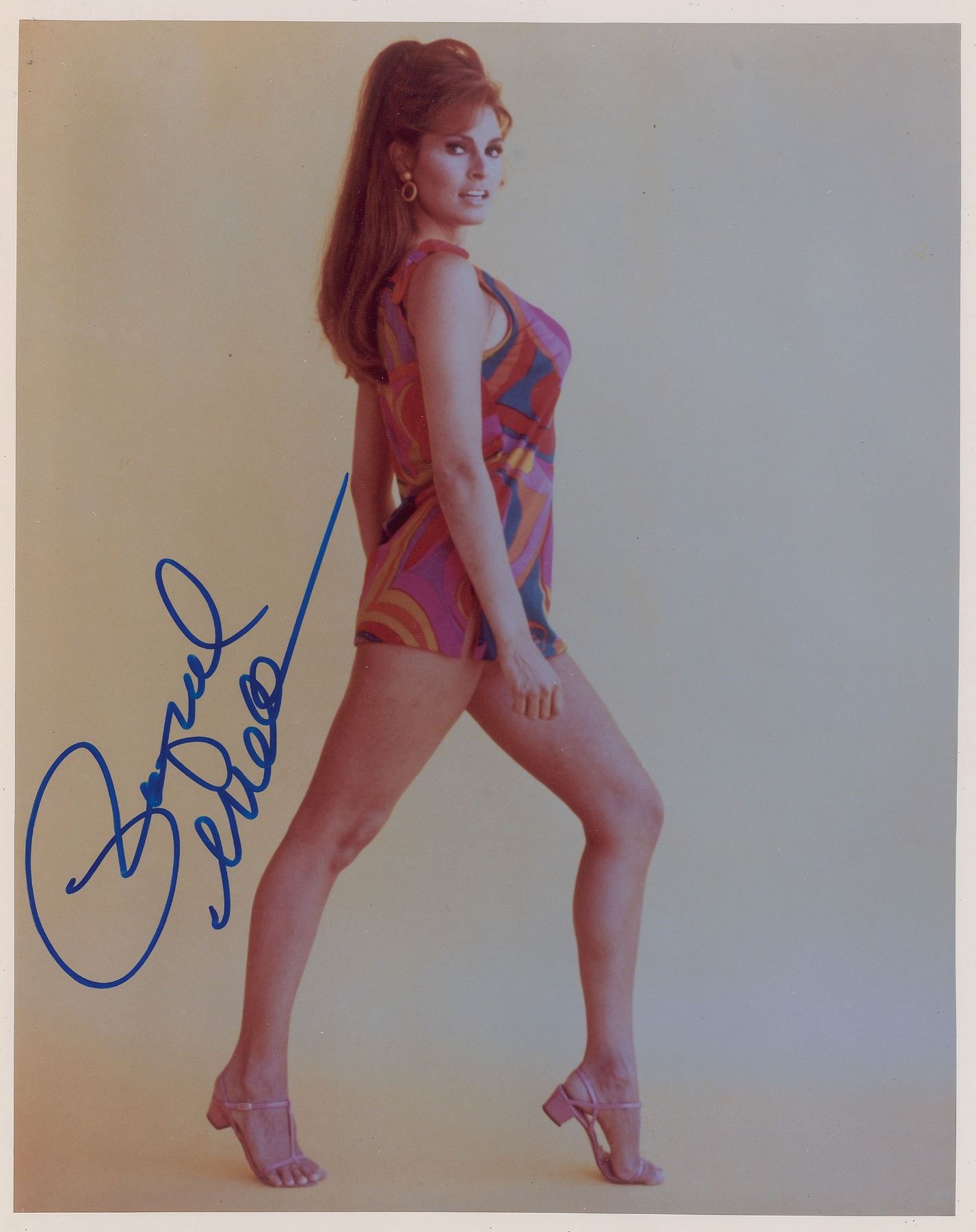 Color glossy 8 x 10 photo of Welch in a short multicolored dress, signed in blue felt tip. In fine condition. Originally obtained by in-person specialist Mike Wehrmann.