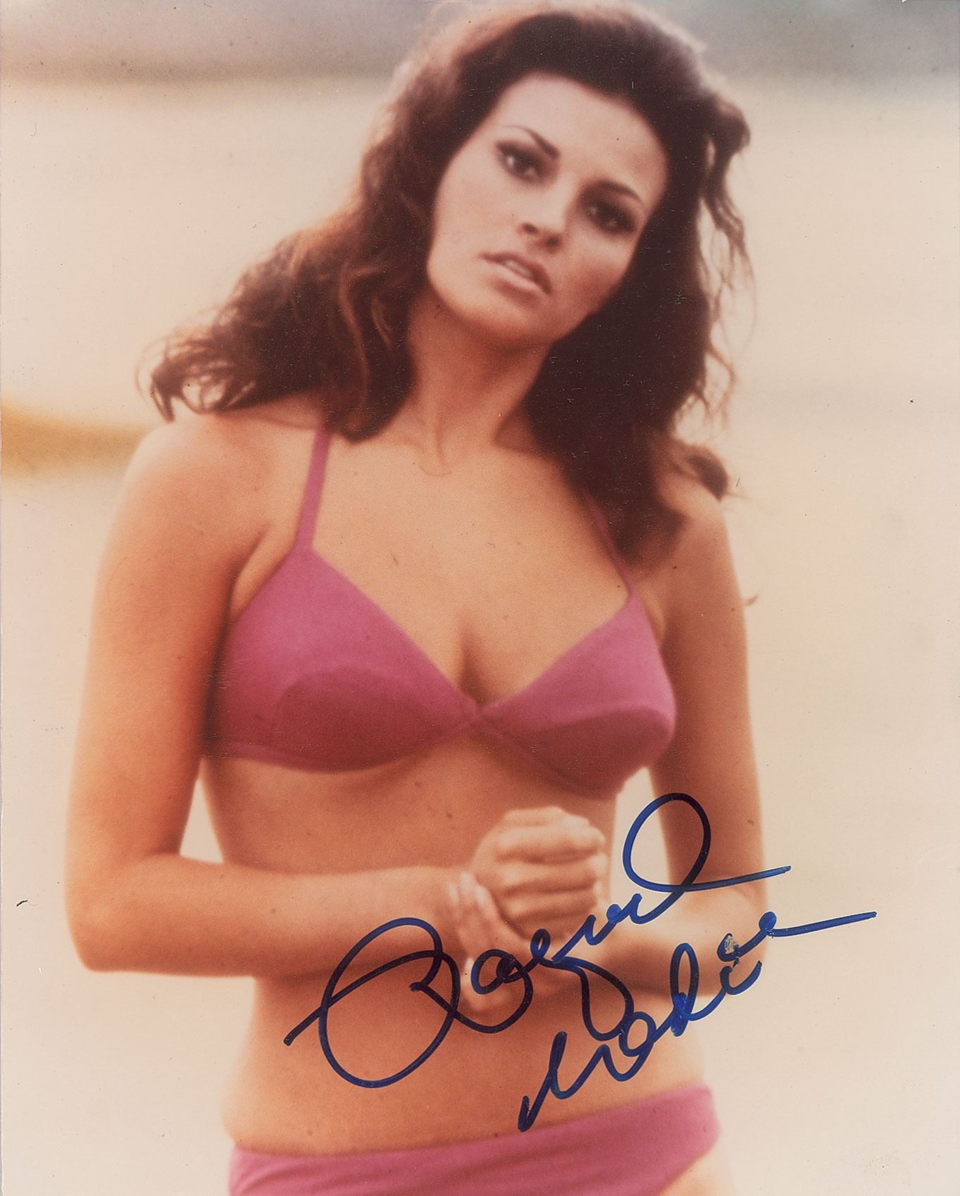 Color glossy 8 x 10 photo of Raquel Welch in a pink bikini, signed in blue felt tip. In fine condition.
