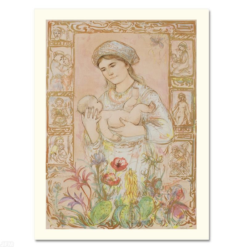 Wild lines and muted colors make Edna Hibel's art stand out in any room. "Raquela" is a limited edition lithograph on paper, numbered and hand signed by Hibel. Includes Certificate of Authenticity! Measures approx. 26.5" x 37.5" (with border) 23.5" x 33" (image).