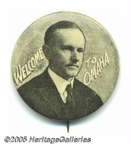 <B>Rare 1 1/4" Nebraska Button for Coolidge</B></I> Most distinctive design, with diagonal "Welcome to Omaha" in unusual script. Choice condition. Lot:262