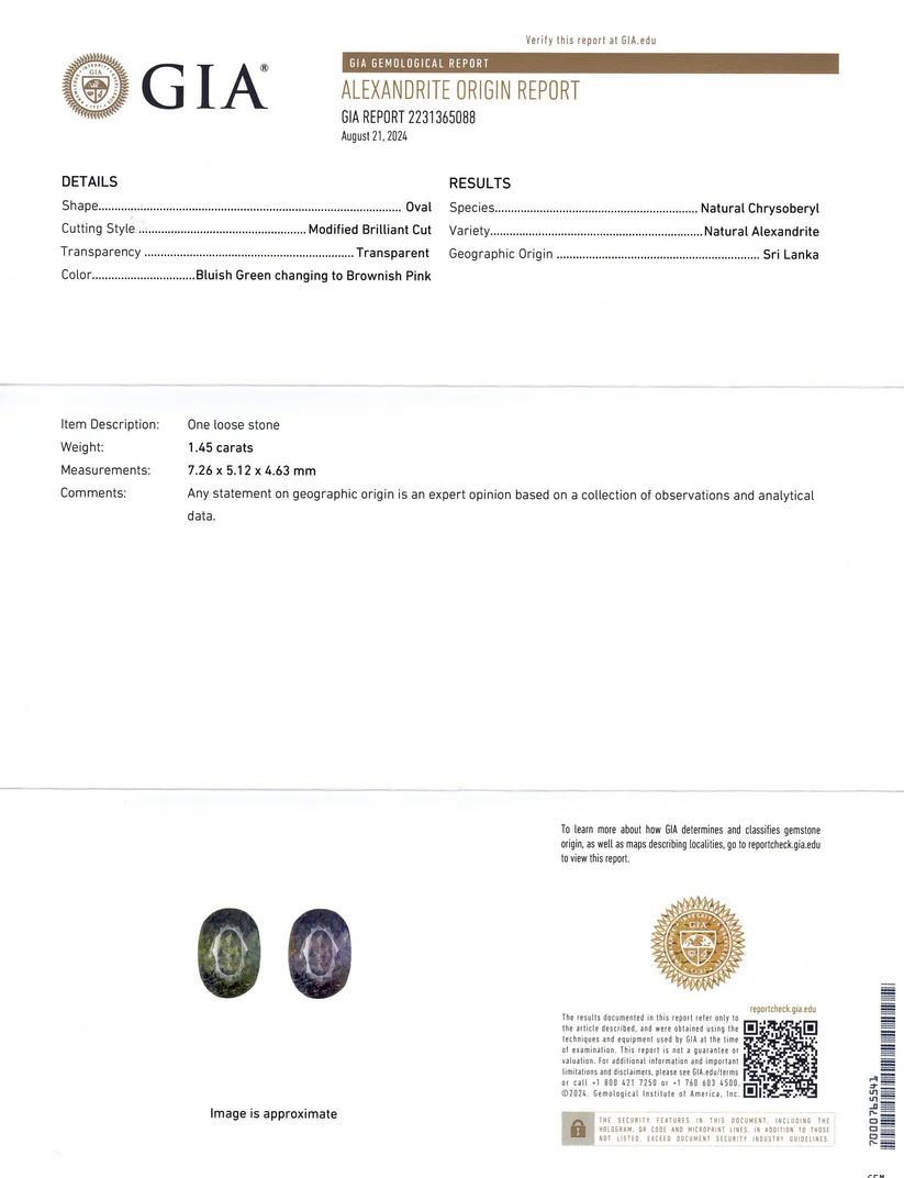 Gorgeous 1.45 Ct Blue Green to Brownish Alexandrite is an oval brilliant cut measuring 7.26 x 5.12 x 4.63 mm. Showcases a medium light tone and moderately strong saturation. This gemstone is stunning!!! Origin: Sri Lanka. Treatment: None. Please see the certification for additional information.