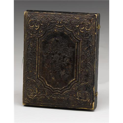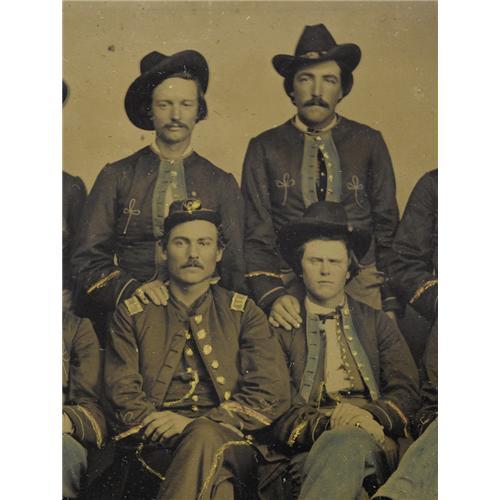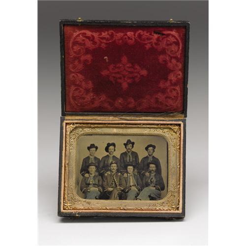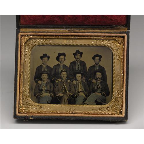 <B>Rare 1/4th Plate Tintype With Zouave Group Portrait.</B></I> Eight members of a Federal Zouave company are posed here in fanciful North African splendor characterized by wide jacket facings, braided embroidery and cuff piping. Their uniforms are characteristic of those first worn by Indiana Zouaves, yet this style came to be favored by troops from other states as well who were stationed along the Gulf coast. Among the sitters is the group's captain with his shoulder insignia being clearly visible. The photographer has lightly colored the soldiers' britches with a blue tint and has added gold to the buttons per the day's custom. This portrait is well-composed with a horizontal orientation that presents the group effectively in a small space. The surfaces of the photograph are excellent. The front of the case has separated, yet can easily be repaired.<BR><BR><b>Shipping:</b> Small Collectibles (<a target="_blank" href="http://www.heritageauctions.com/common/shipping.php">view shipping information</a>)
