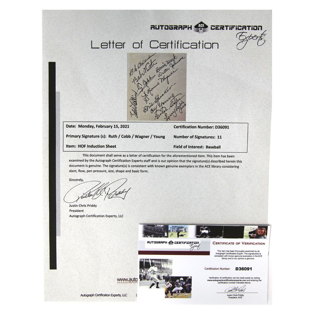 Baseball Hall of Fame (1939–Present). This Incredible Piece of Baseball History is signed by 11 of the Iconic 1939 First Hall of Fame Class including, Babe Ruth, Tris Speaker, Ty Cobb, Connie Mack, Walter Johnson, Eddie Collins, Larry Lajoie, Honus Wagner, Grover Cleveland Alexander, Cy young, and George Sisler. All signed signatures are in black ink, the signatures are clean and clear and are as crisp as the day they were signed. The Hall of Fame was established in 1939 by Stephen Carlton Clark, an heir to the Singer Sewing Machine fortune. Clark sought to bring tourists to a city hurt by the Great Depression, which reduced the local tourist trade, and Prohibition, which devastated the local hops industry. Clark constructed the Hall of Fame's building, and it was dedicated on June12, 1939. (His granddaughter, Jane Forbes Clark, is the current chairman of the Board of Directors). Comes with a Letter of Certification from Autograph Certification Experts (ACE).