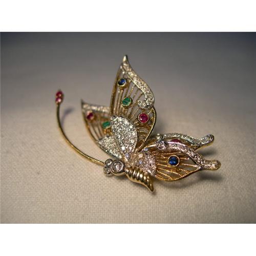 You are looking at an estate 14K yellow gold diamonds and gemstone butterfly brooch. This uniquely designed piece features a gold butterfly with two sapphires, 5 rubies and 2 emeralds all on the wings. All gemstones are natural. The piece also has 78 round diamonds of various sizes. The brooch measures 1 and 5/8 of an inch long by 7/8 of an inch wide. The pin weighs 5.5 grams. It is in mint condition.