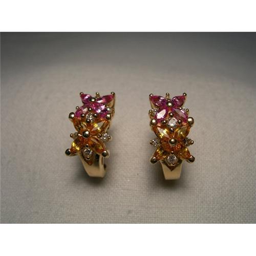 You are looking at a gorgeous pair of 14K yellow gold floral earrings with multi-color sapphires and diamonds. Each earring has 8 natural oval sapphire measuring 3 mm in length and about 1 mm in width. There are also 7 brilliant round diamonds, each measuring a bit under 1 mm in diameter. Each earring measures 5/8 of an inch long and 1/4 of an inch wide. The pair weighs 4.9 grams. They are in mint condition.