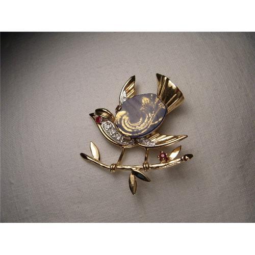 <tr><td>Title:Rare 14K Gold Ruby Diamond Limoge Bird Brooch</td></tr>